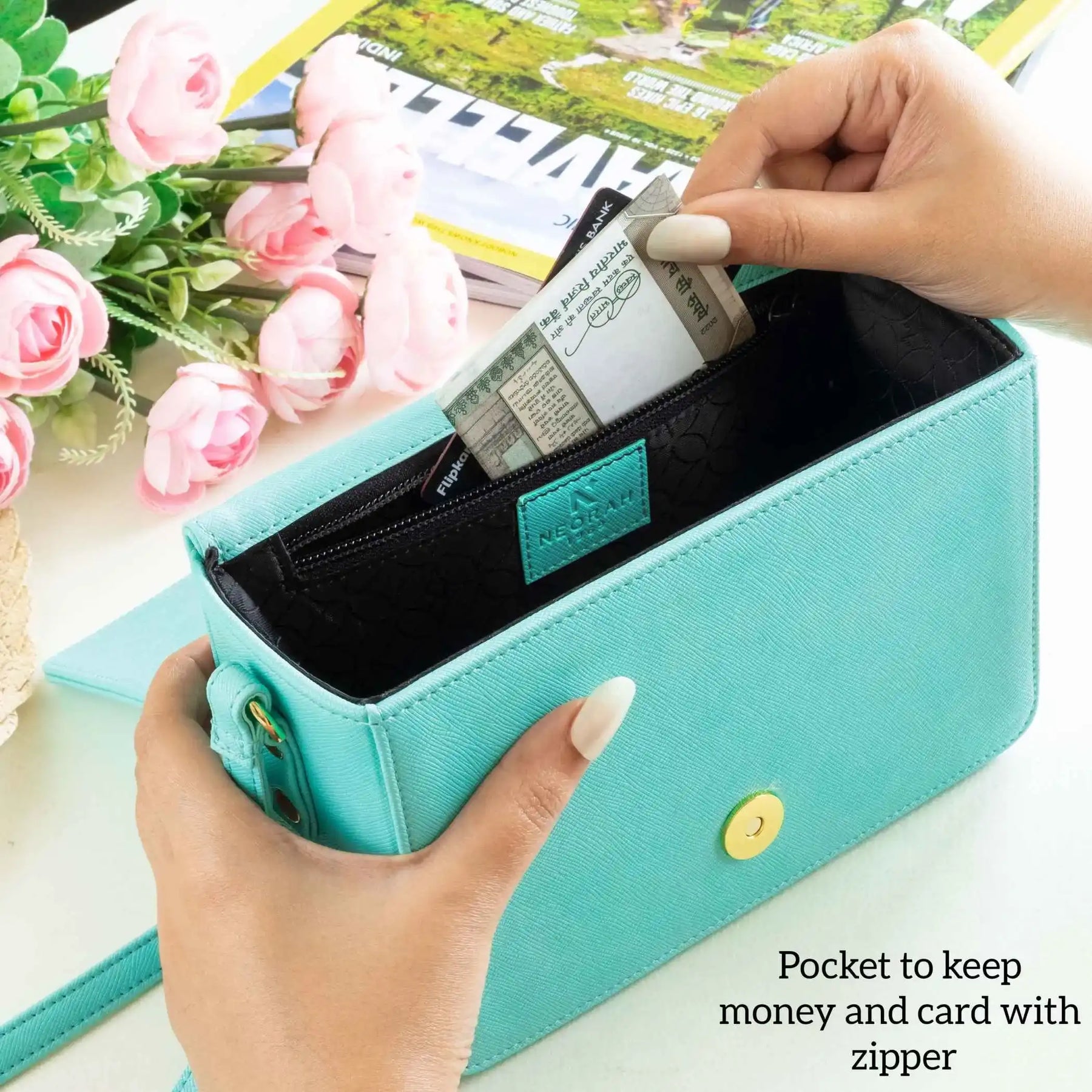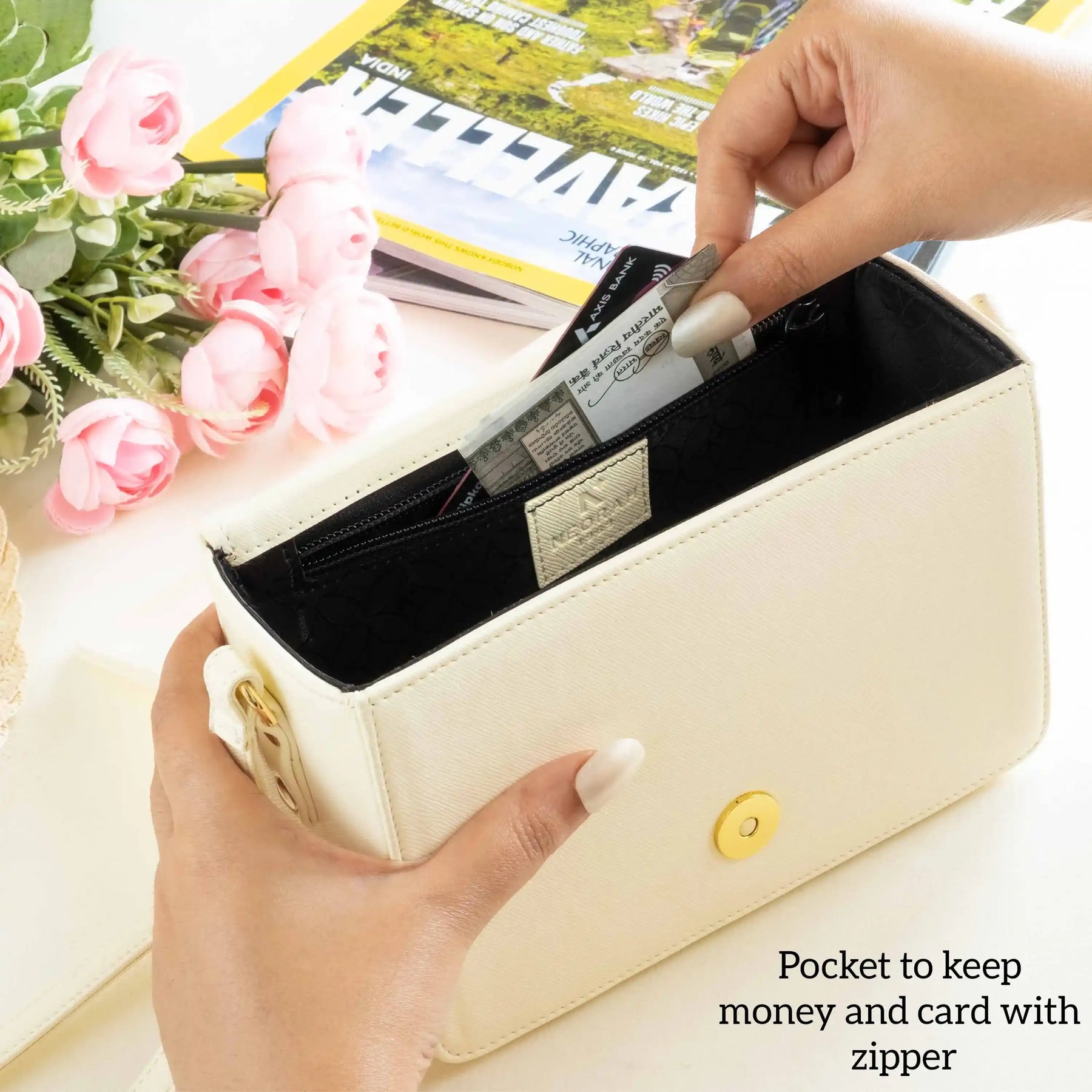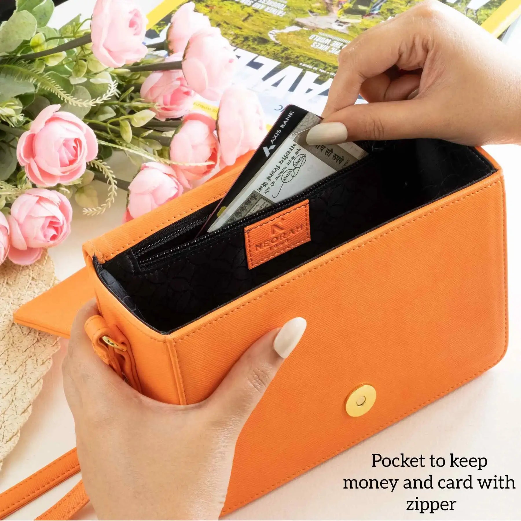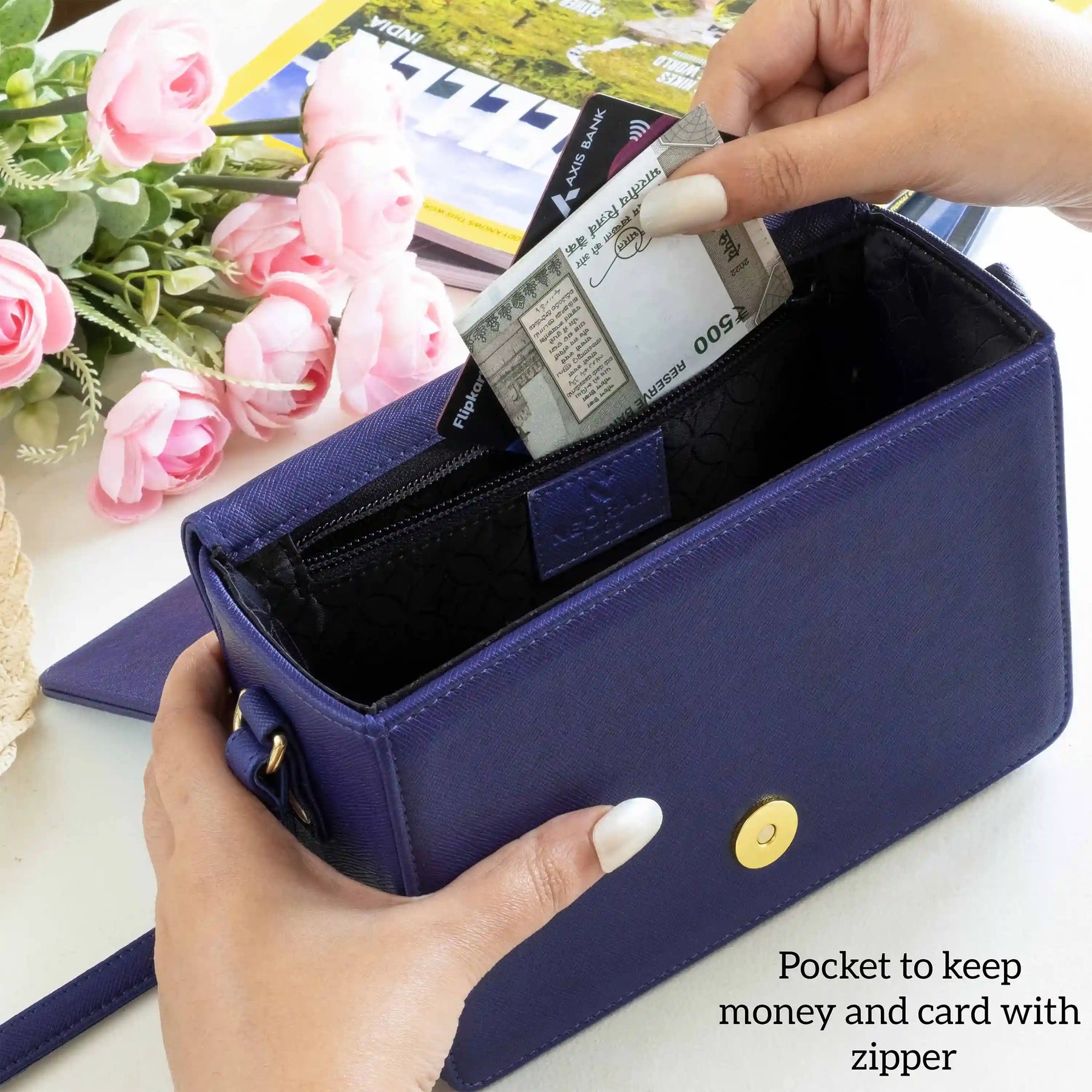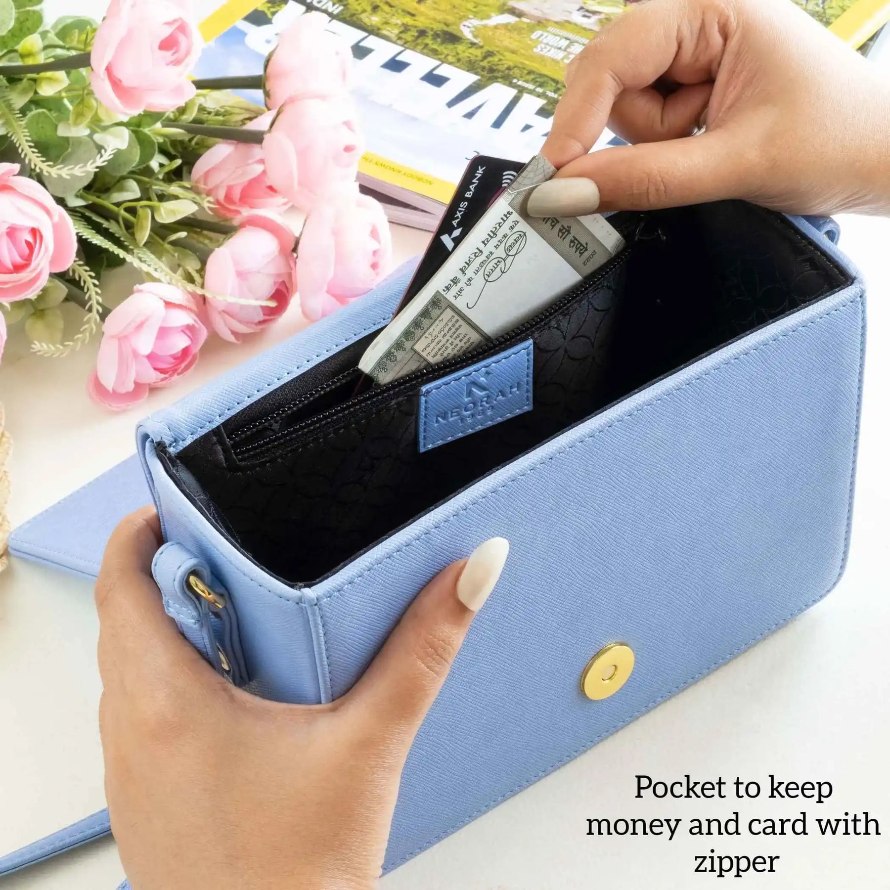 A small zipped compartment on the inside for cards, cash and other necessities.