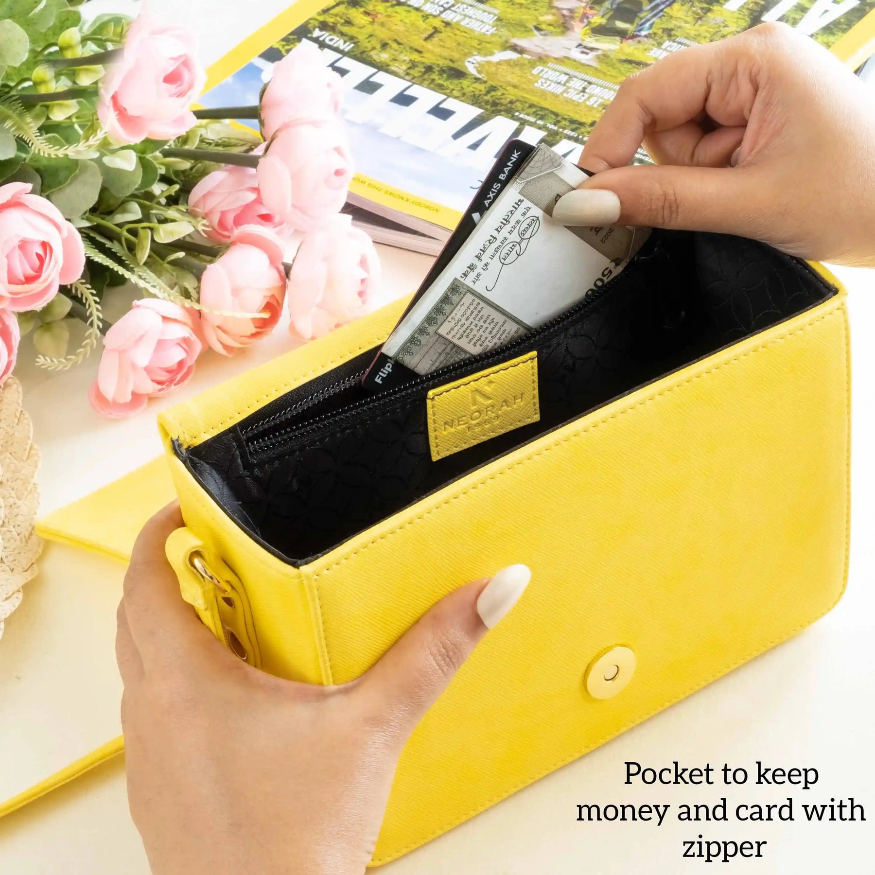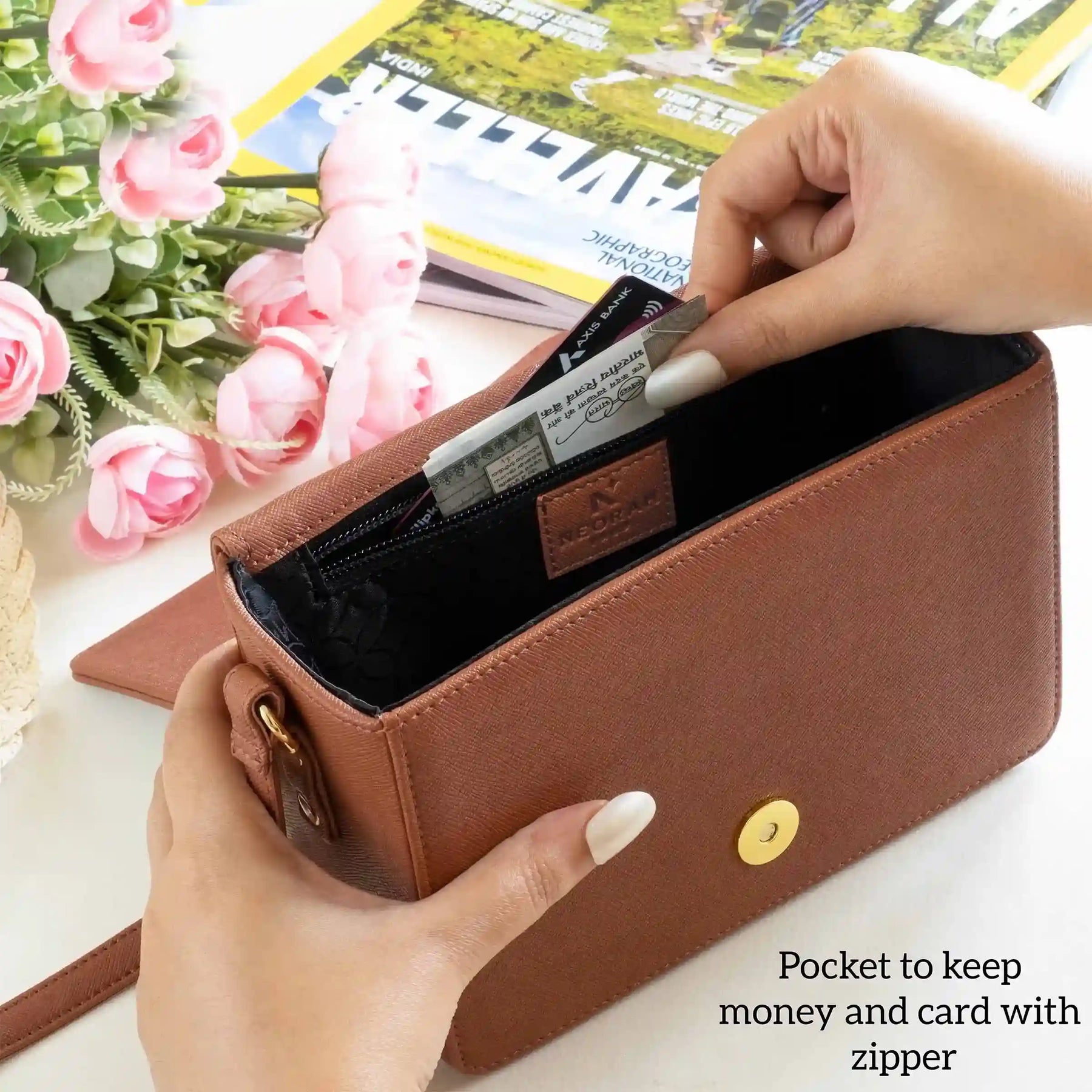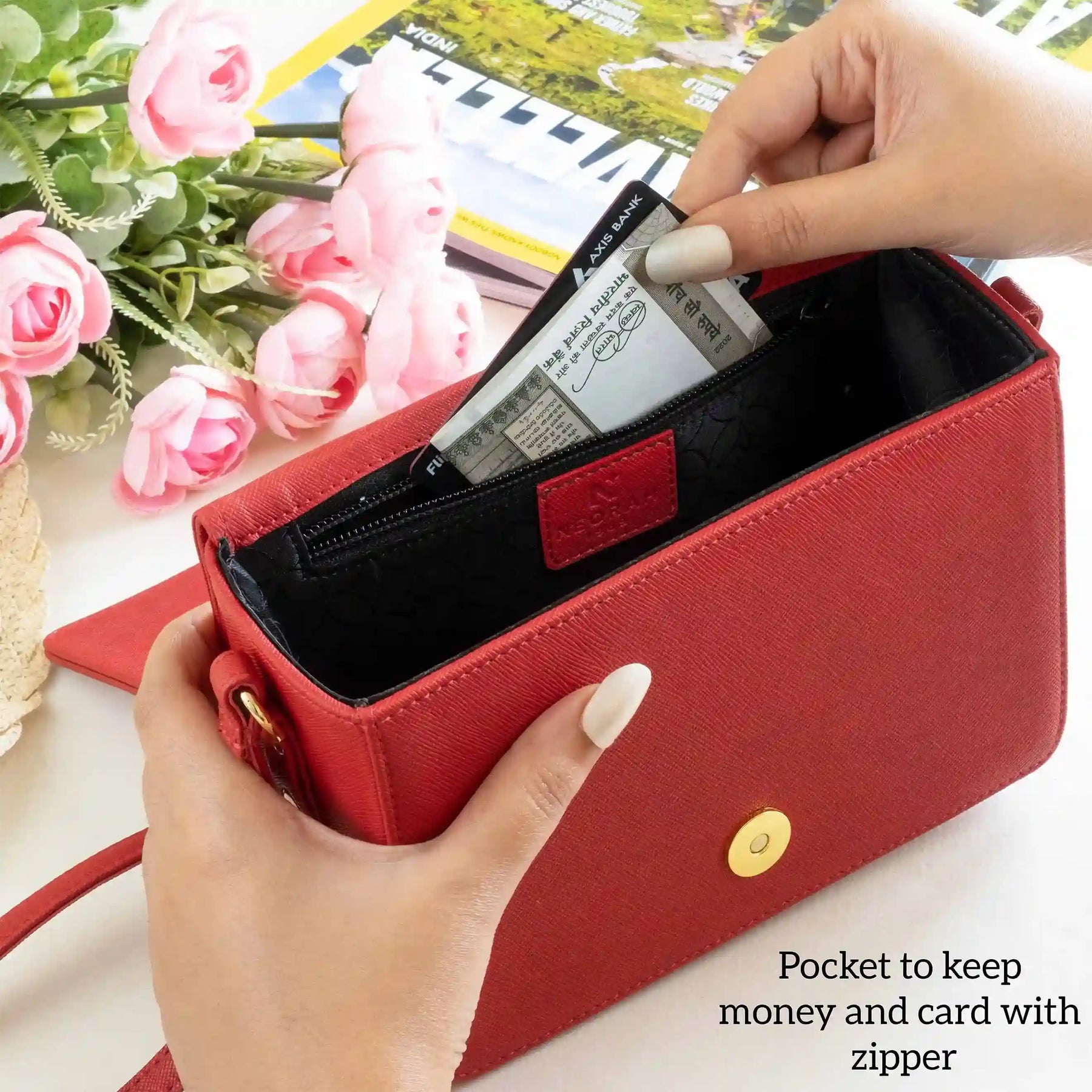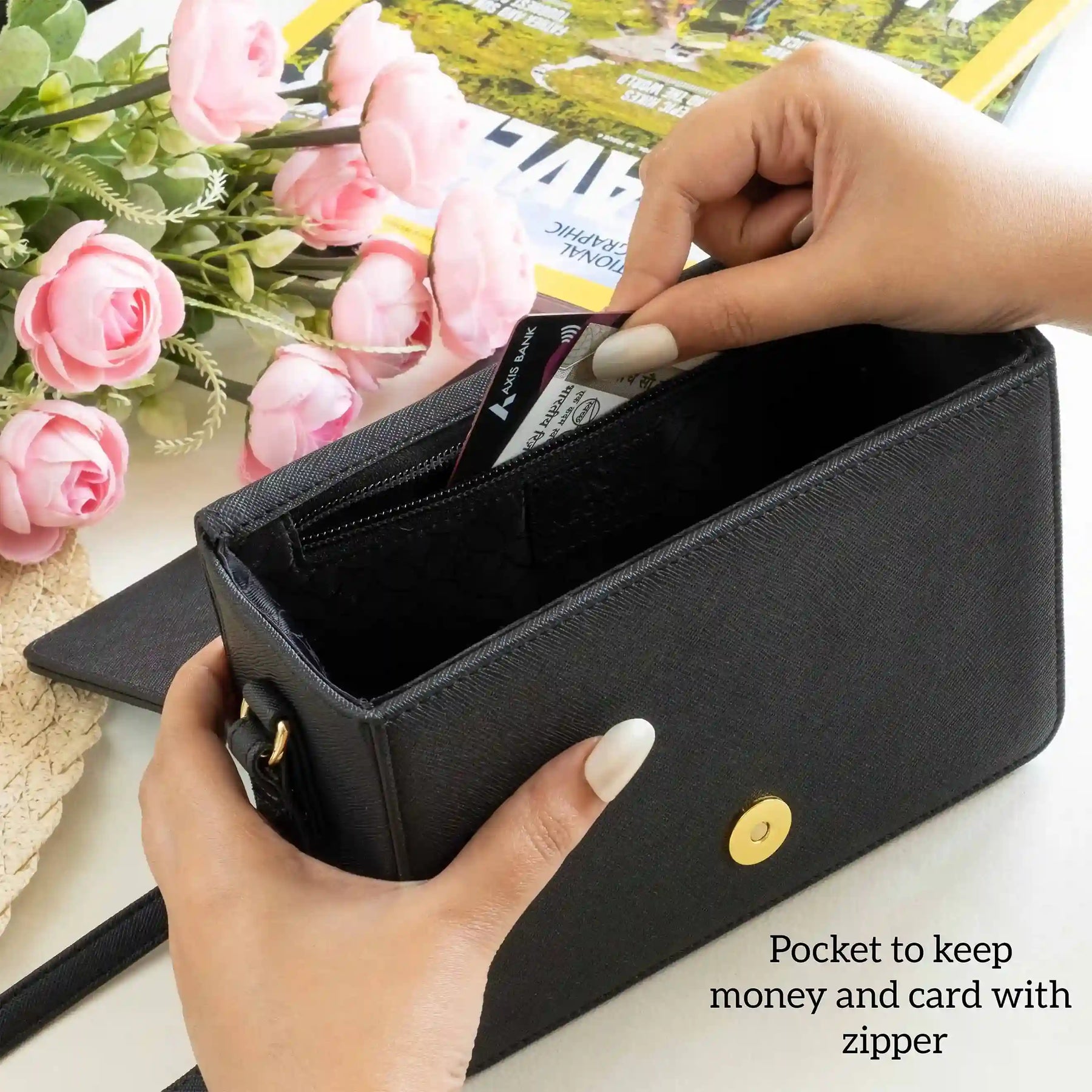 A small zipped compartment on the inside for cards, cash and other necessities.