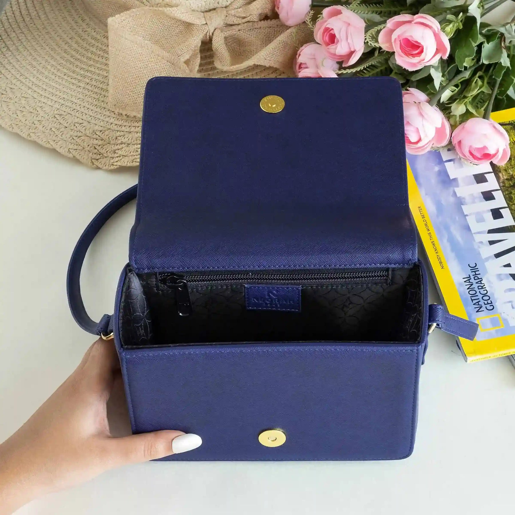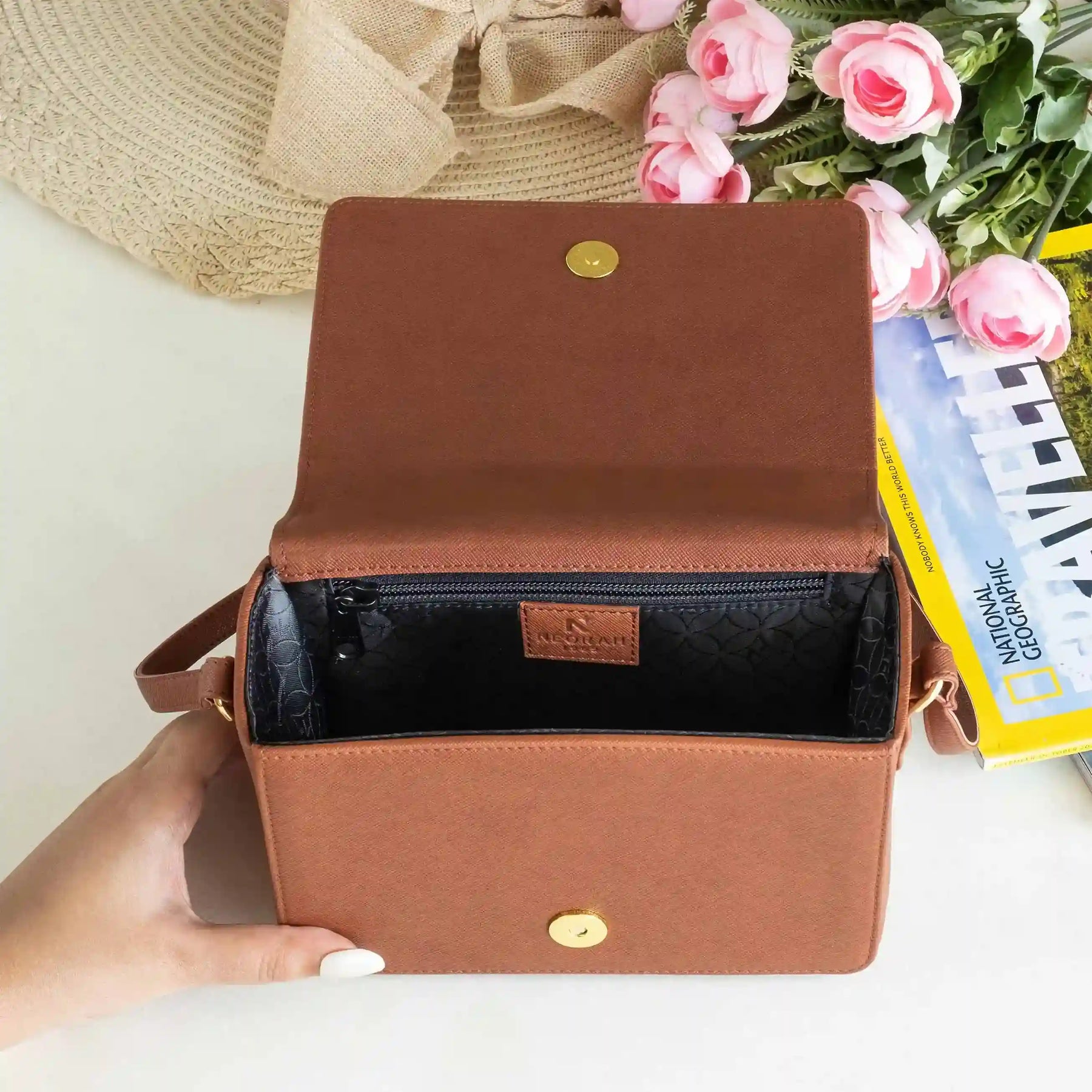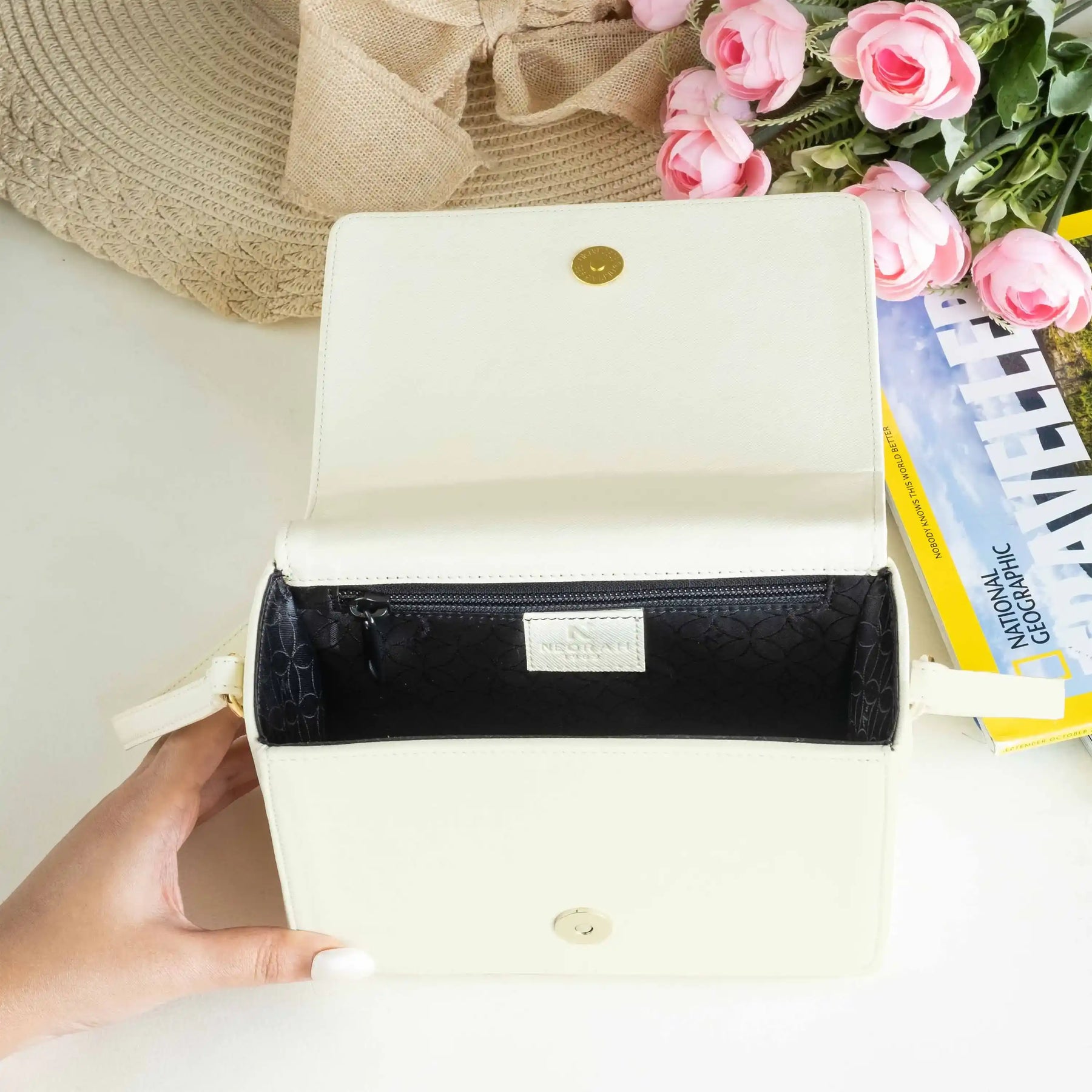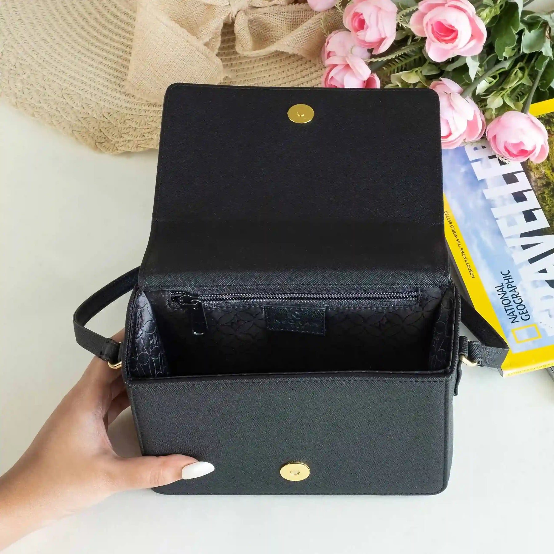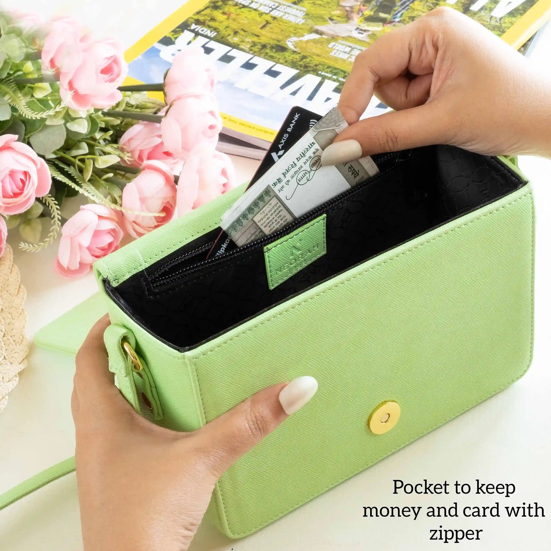 A small zipped compartment on the inside for cards, cash and other necessities.