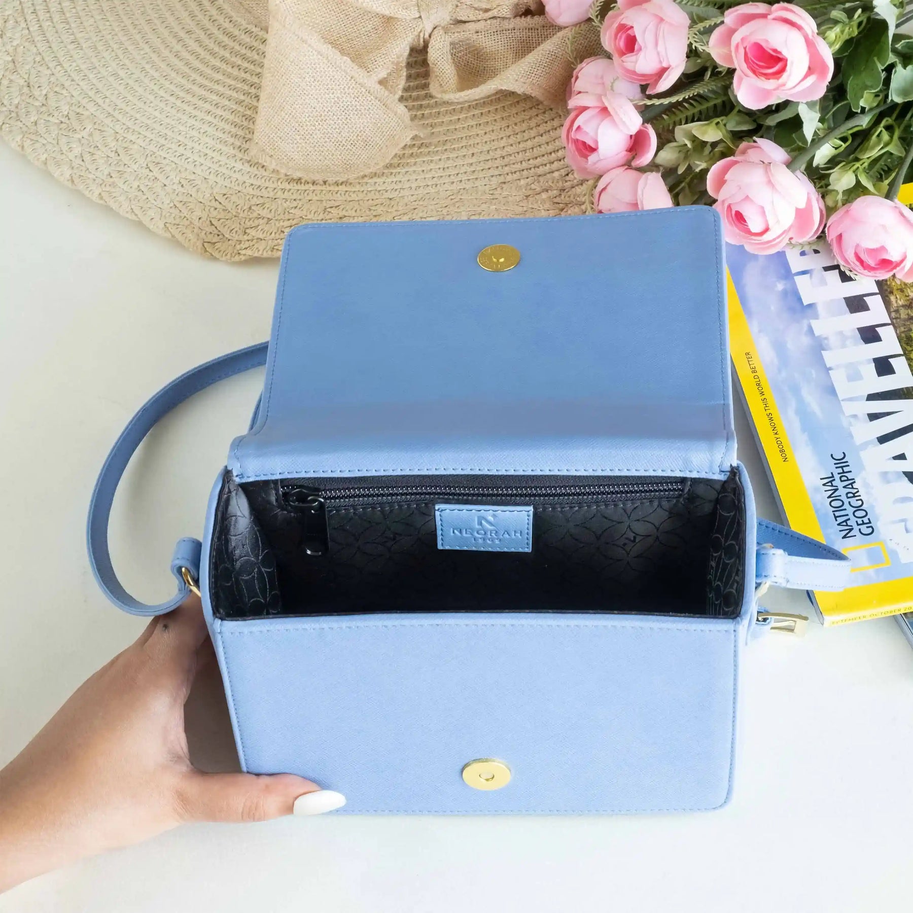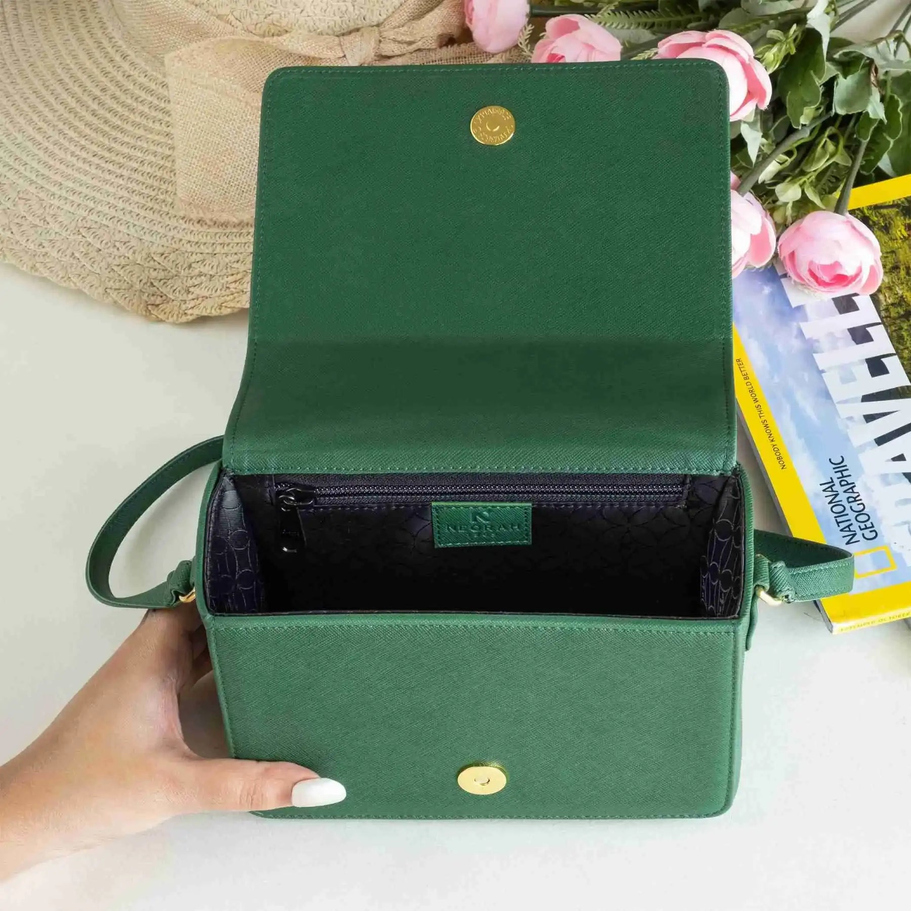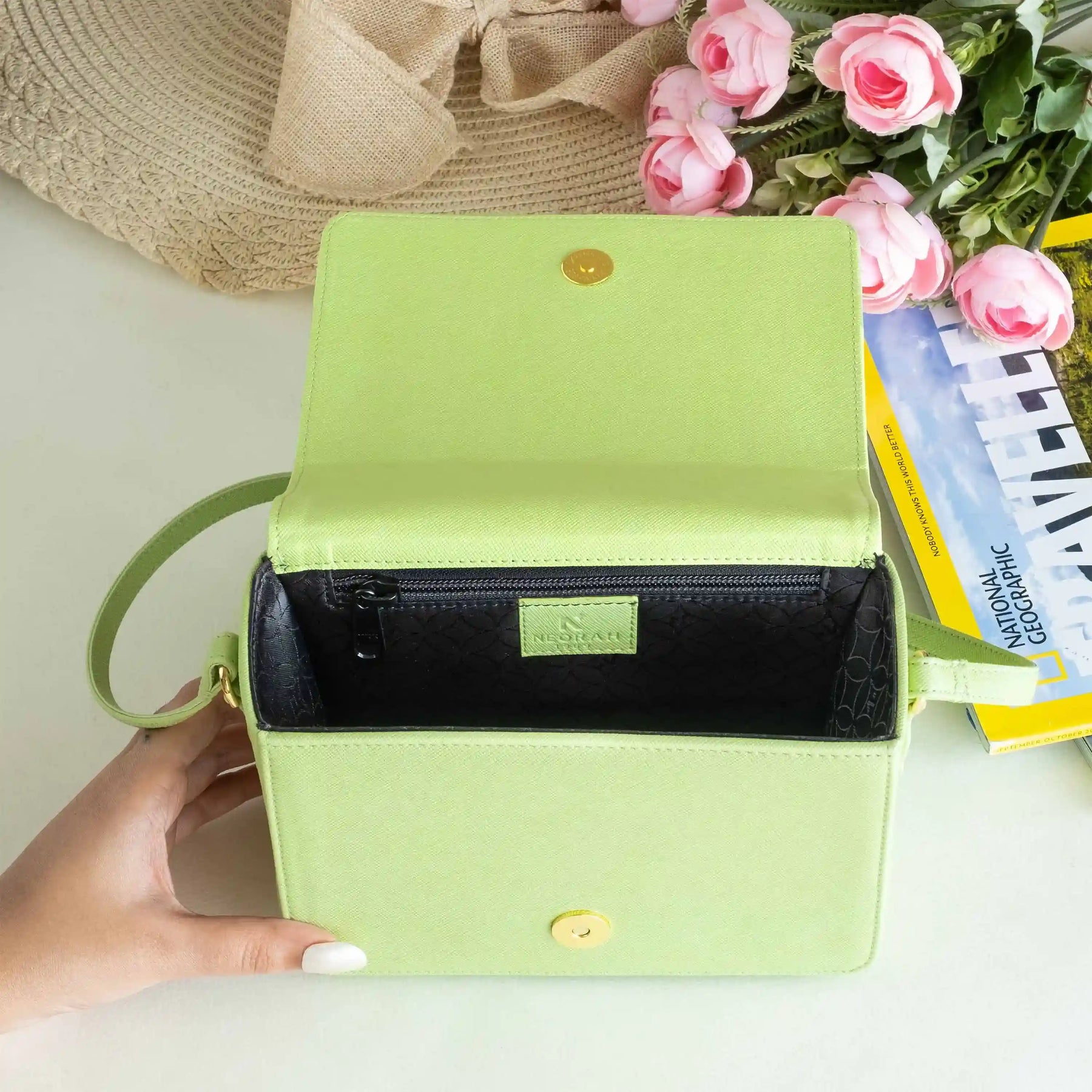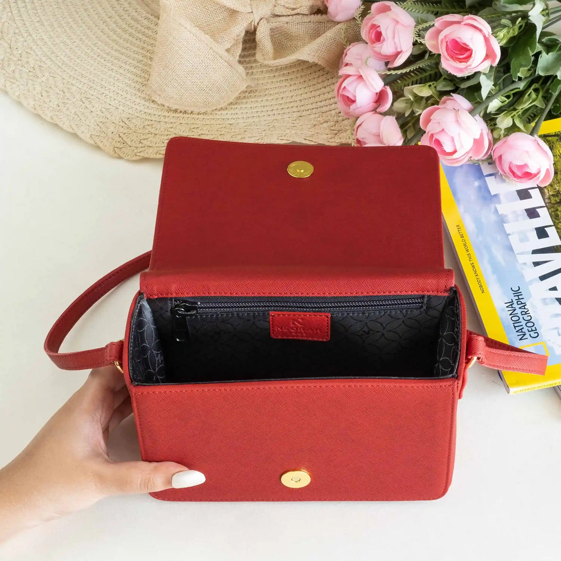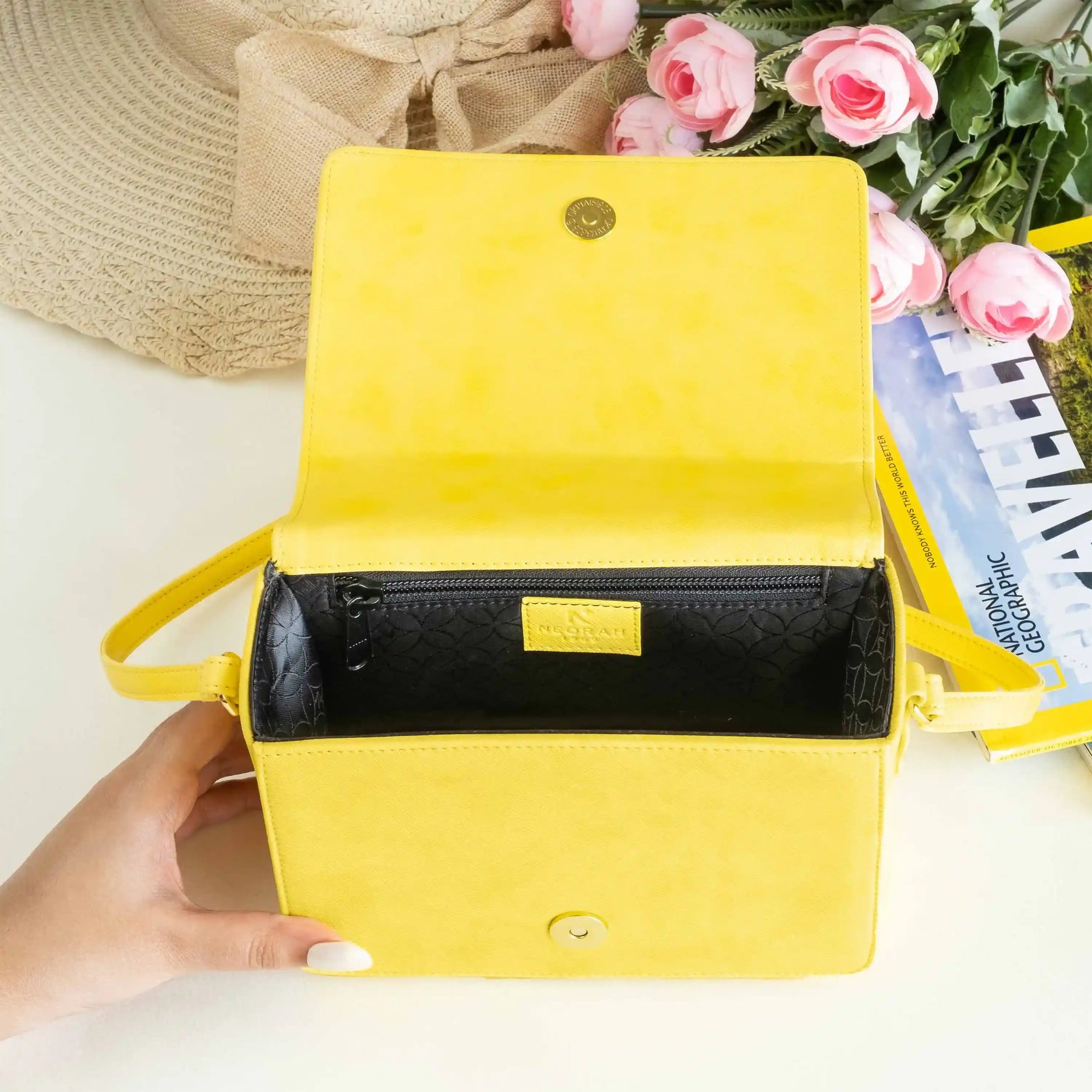 A small zipped compartment on the inside for cards, cash and other necessities.