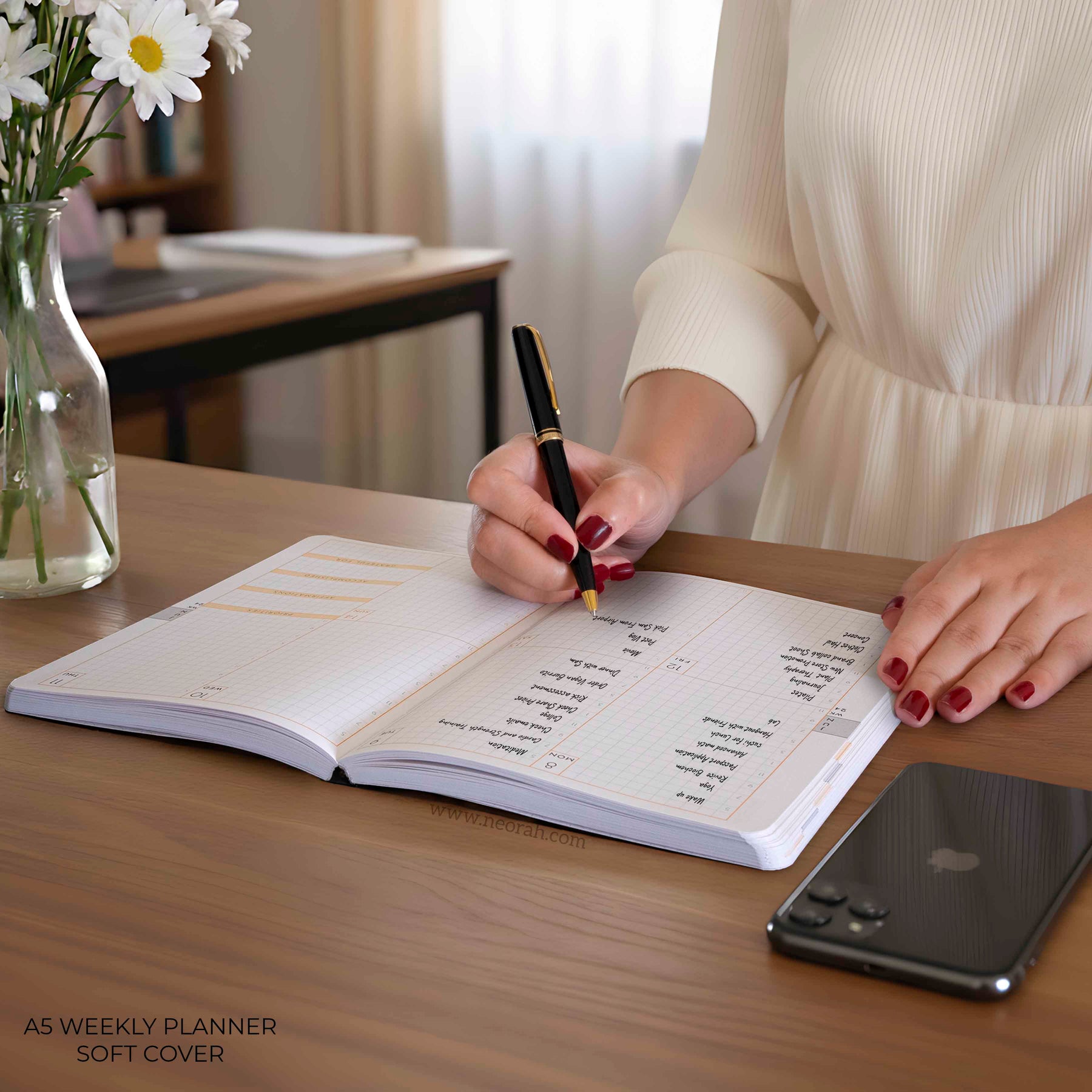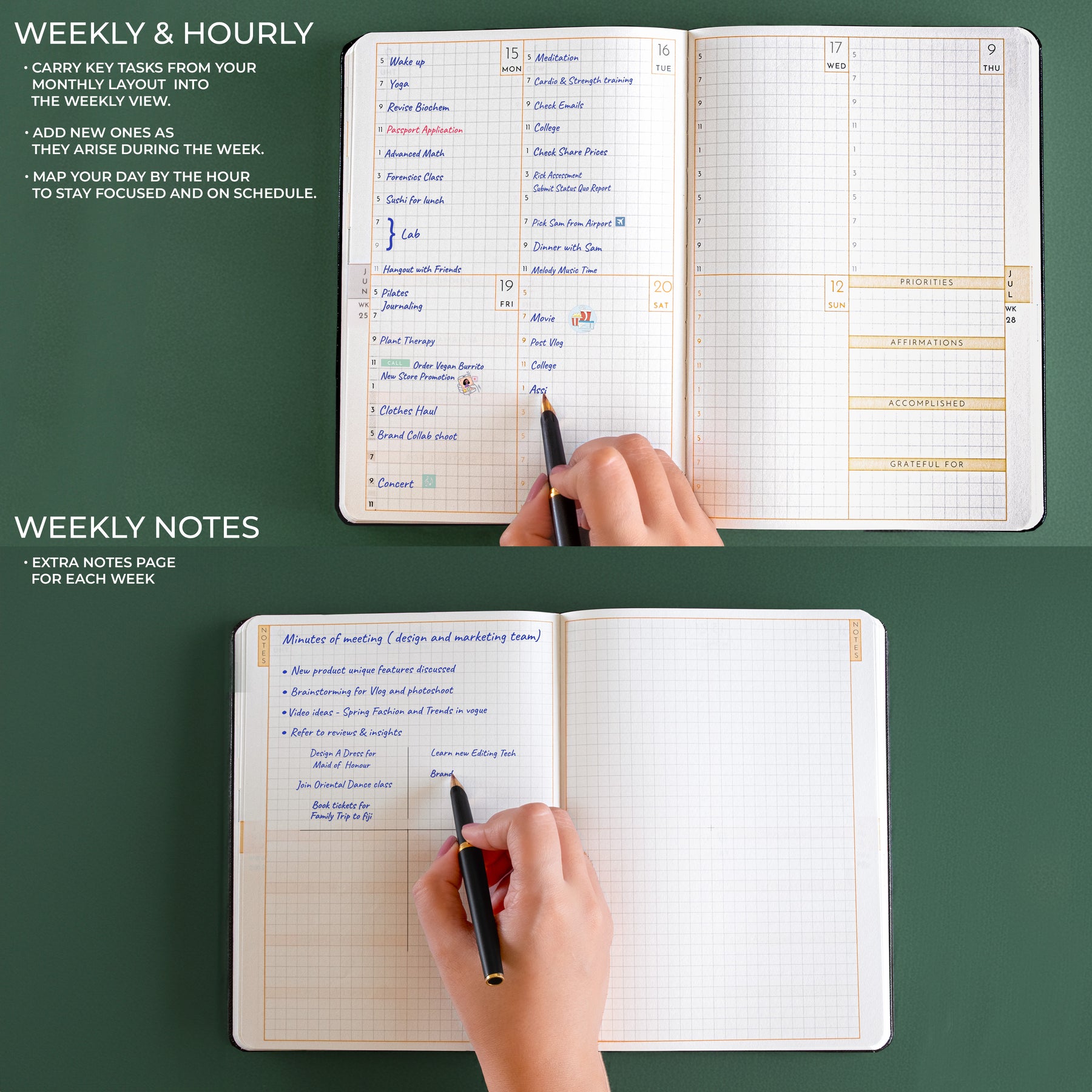 NEORAH B6 2024 planner offers comprehensive organization with daily dated layouts for yearly, monthly, weekly, and hourly planning. Includes 12-month budget and habit tracker wheel for goal tracking. Softcover design adds durability for everyday use. Features sections for health, priorities, affirmations, accomplishments, and gratitude. Ideal for work, study, and personal use. Comes with planner box for convenient storage.