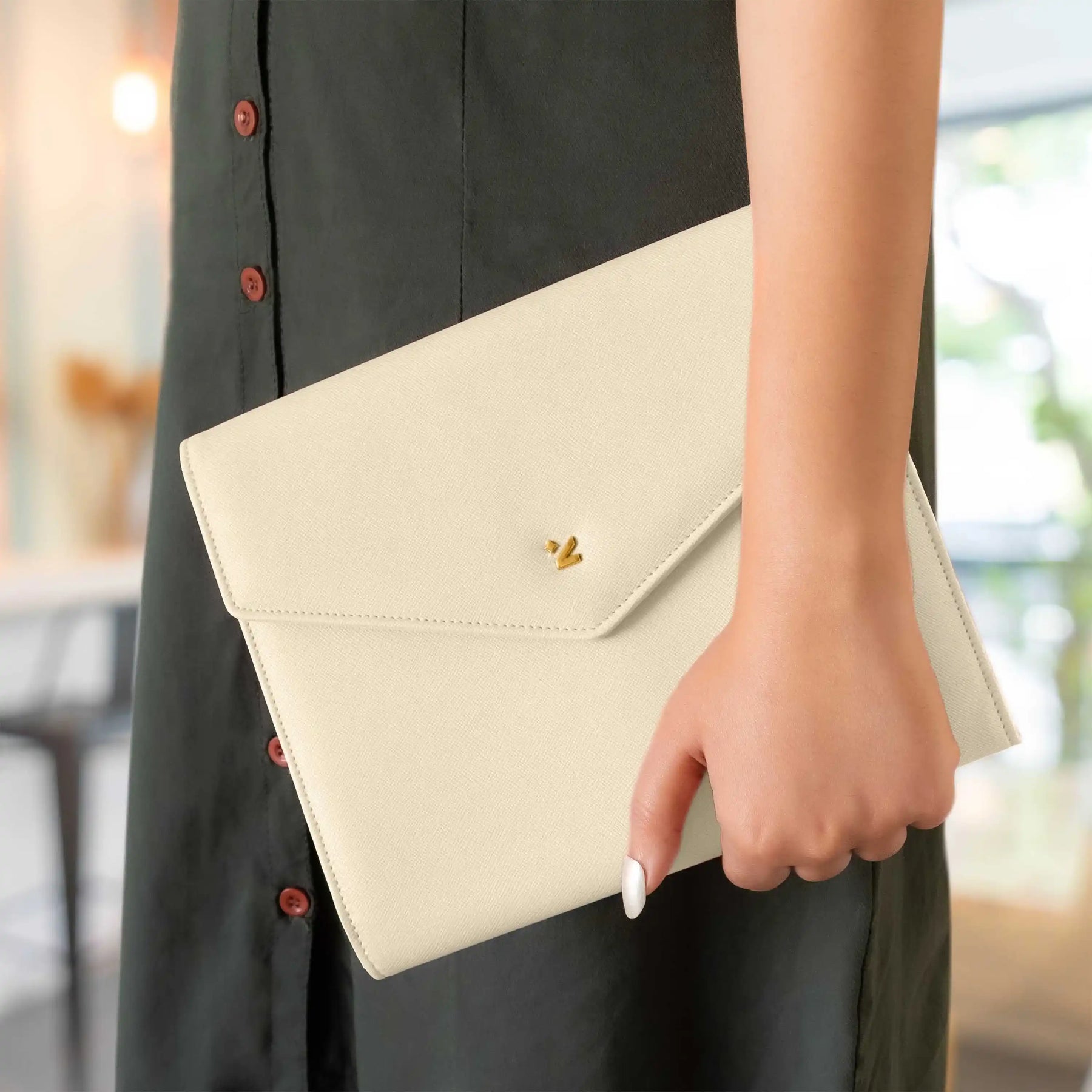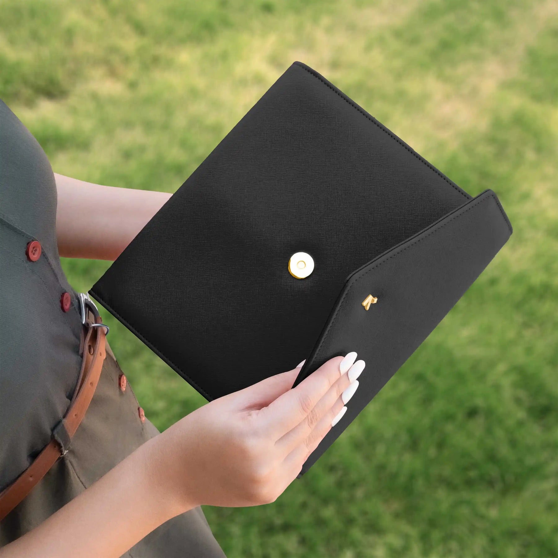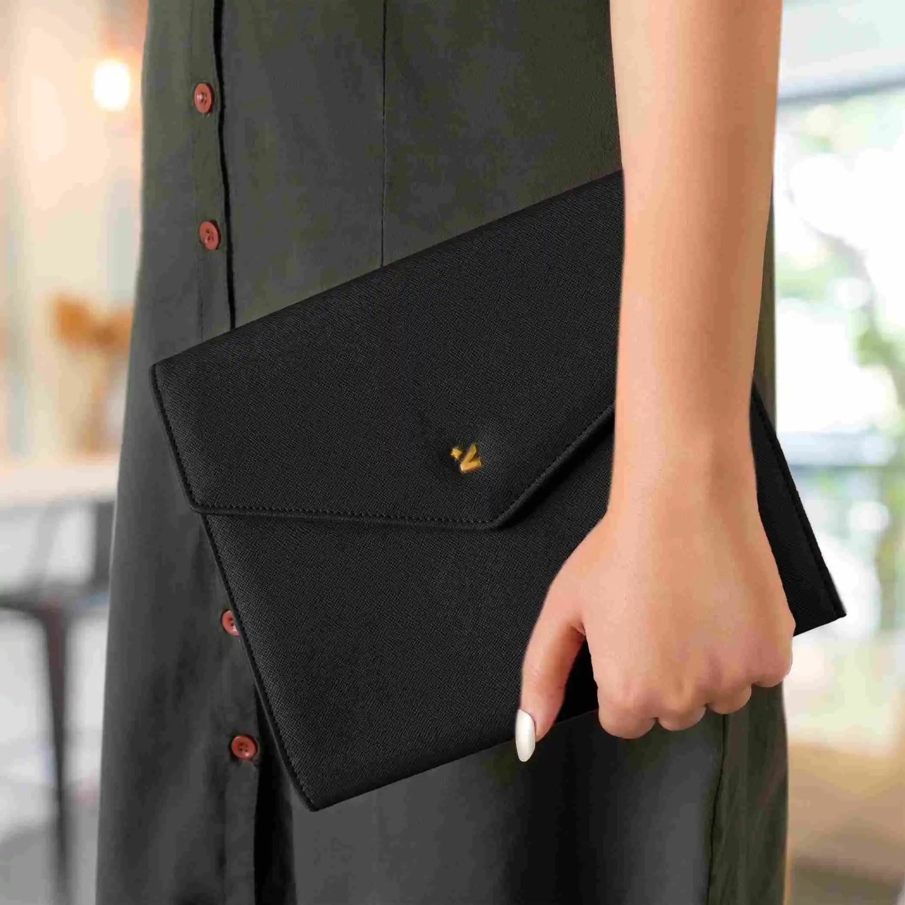 [ HANDCRAFTED TO PERFECTION ] - Fine crafted Vegan Leather organiser is enclosed by a magnetic closure envelope flap revealing compartments lined with silk blend material to keep your essentials secure.