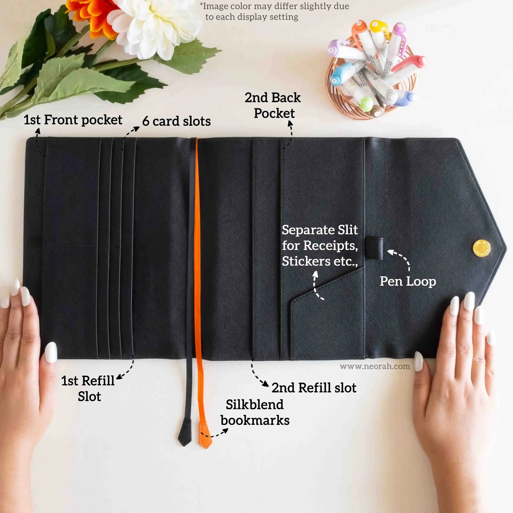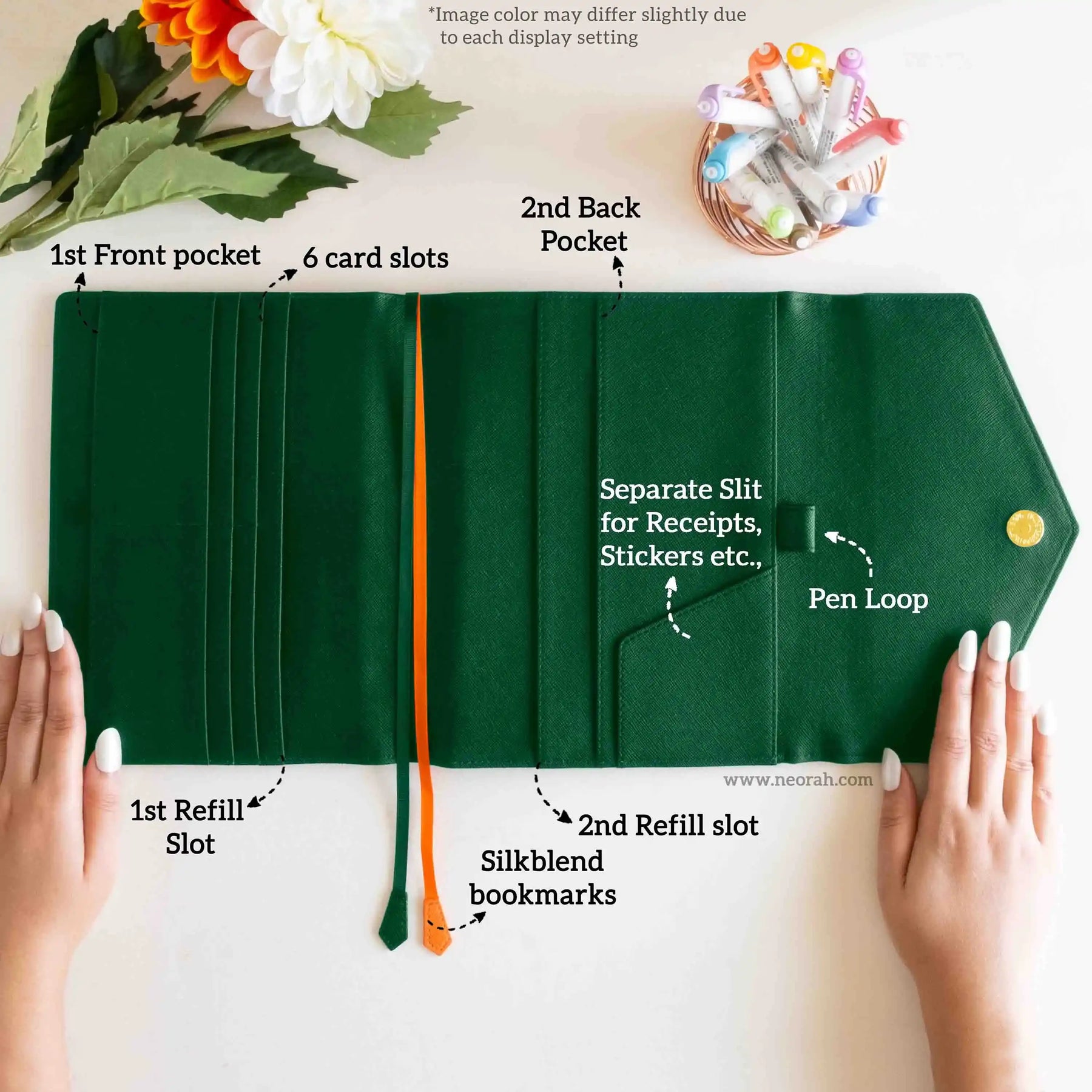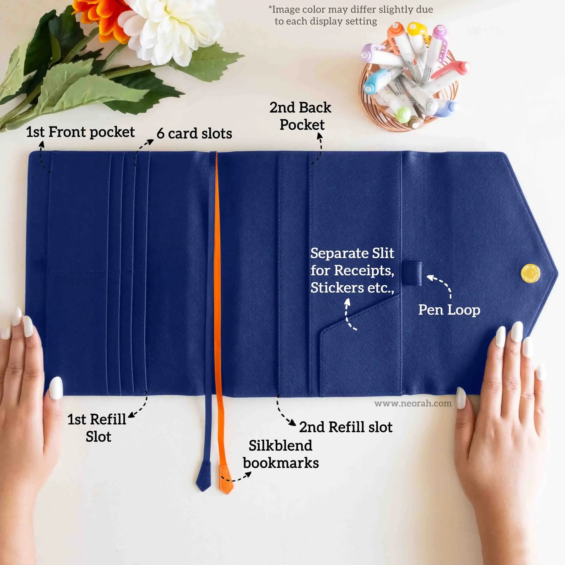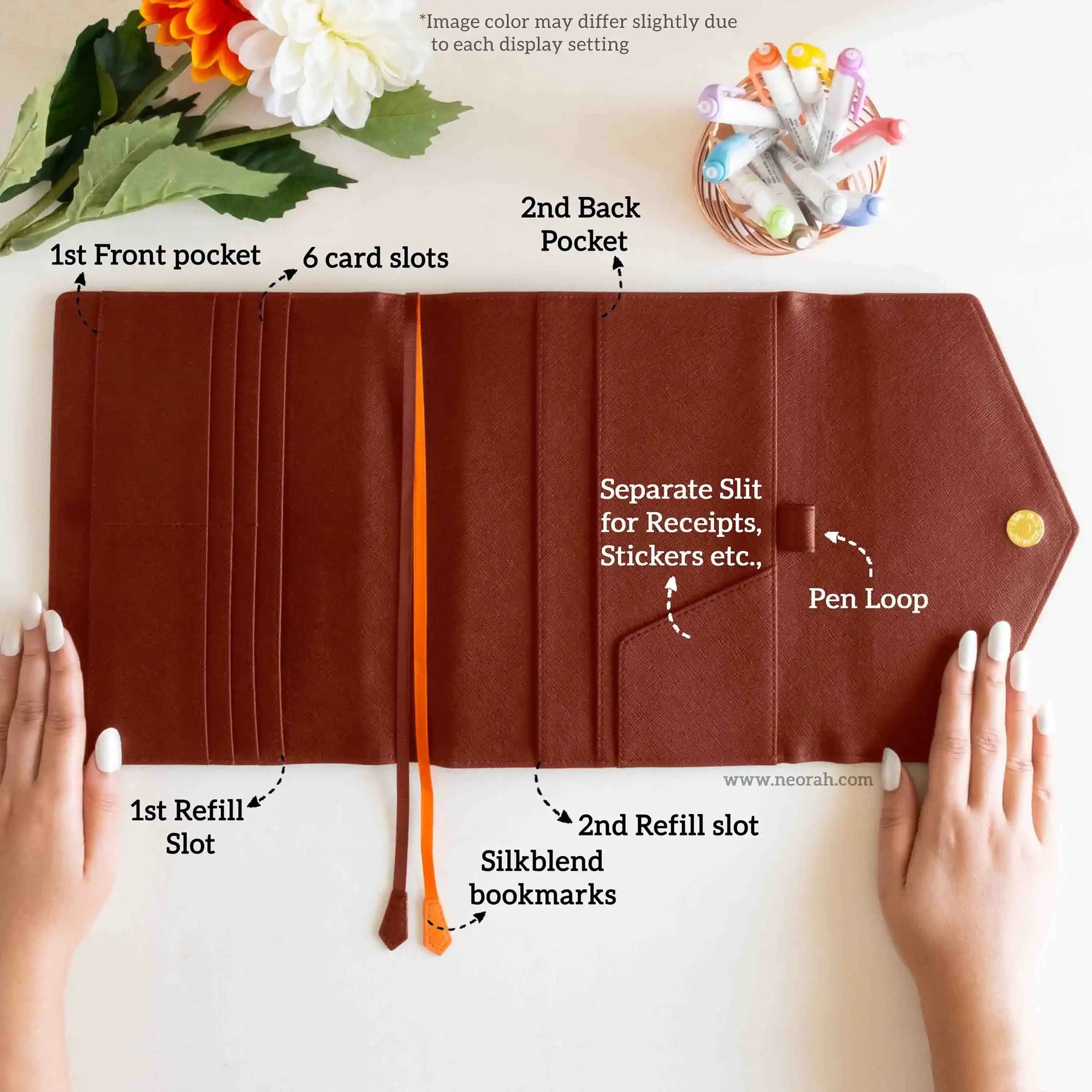 It has 2 dedicated compartments on the inside to insert your replaceable notebooks/journals/planner. 2 durable silk blend bookmarks 6 card slots 2 compartments a side slot which keeps your credit cards, debit cards, boarding pass, stickers etc.