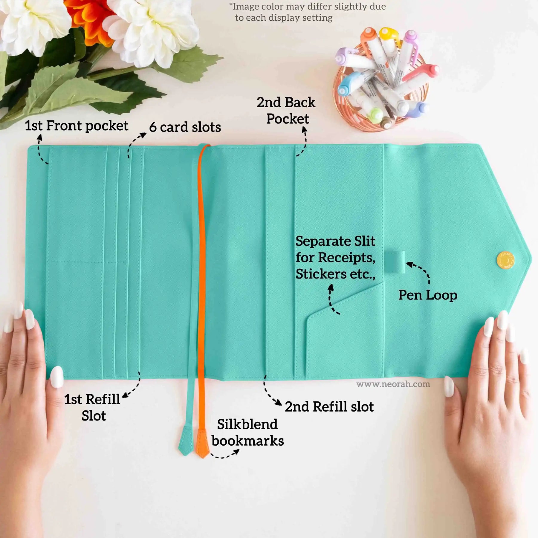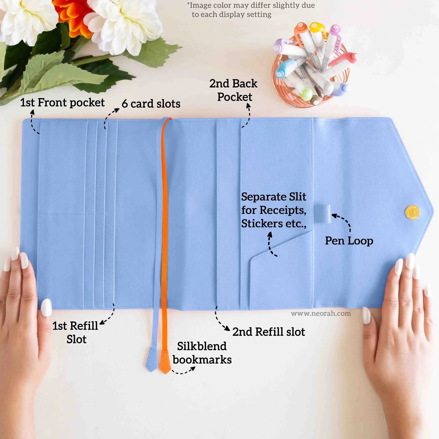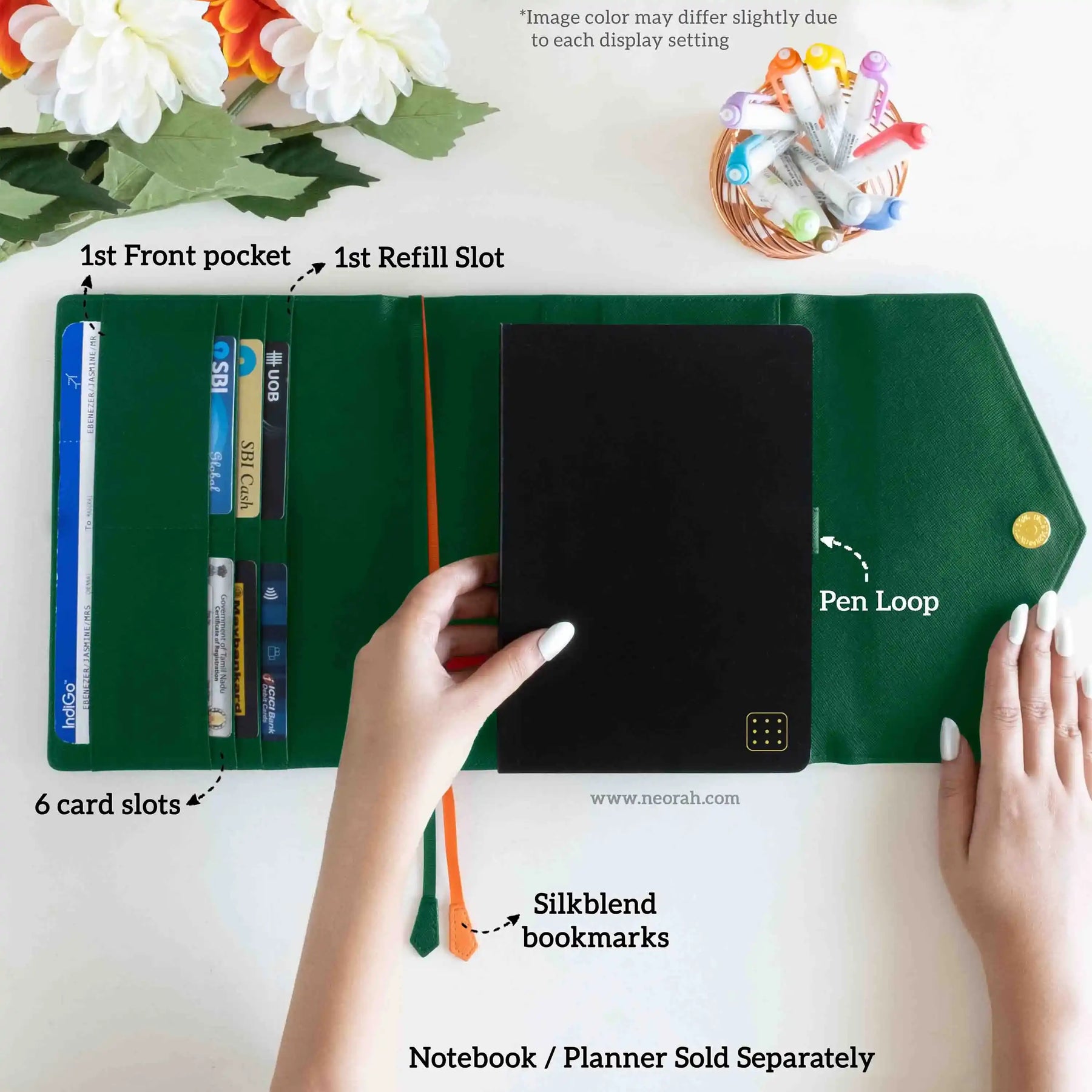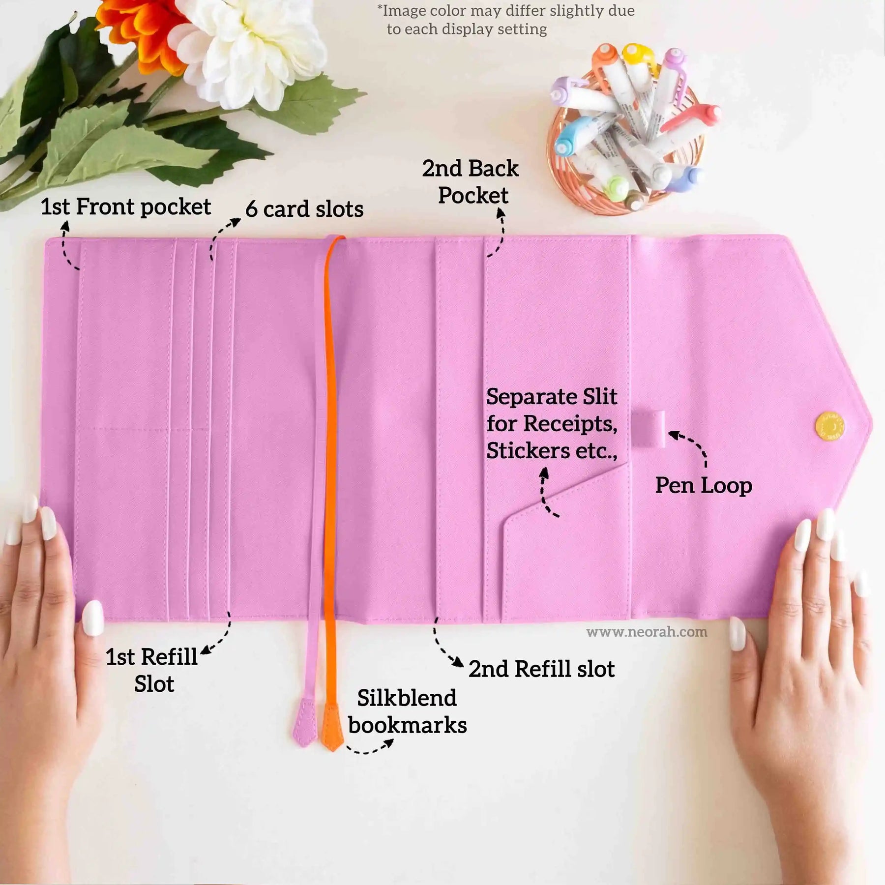 It has 2 dedicated compartments on the inside to insert your replaceable notebooks/journals/planner. 2 durable silk blend bookmarks 6 card slots 2 compartments a side slot which keeps your credit cards, debit cards, boarding pass, stickers etc.