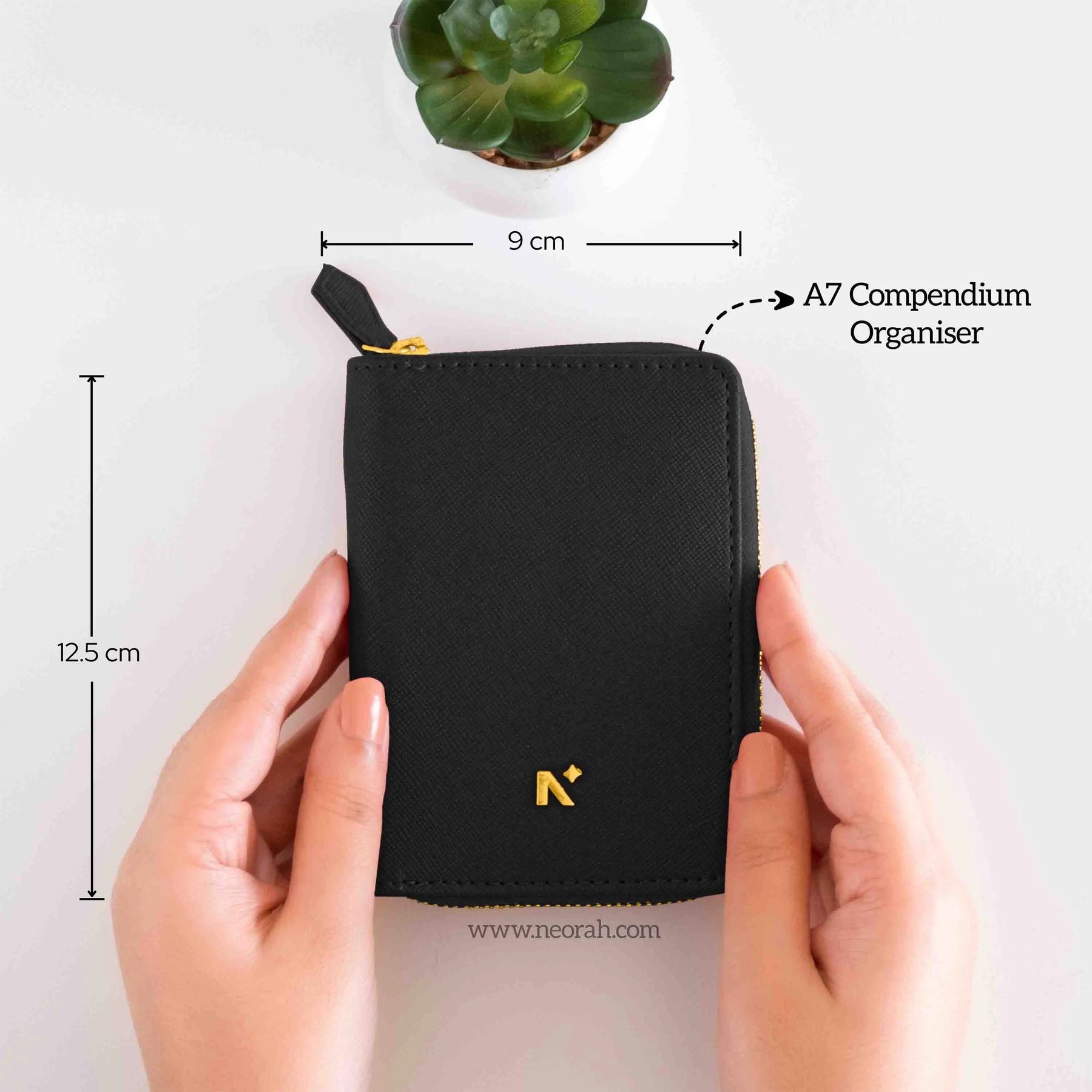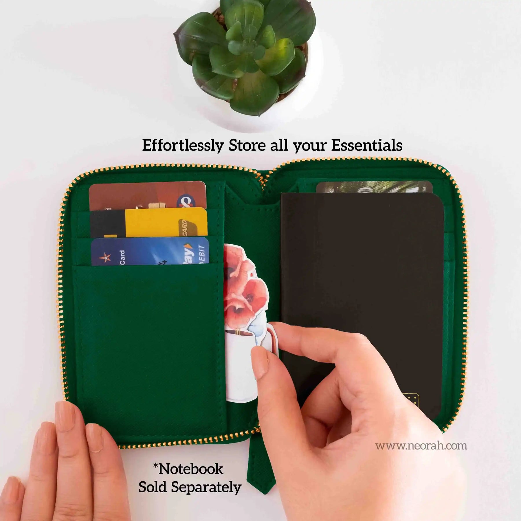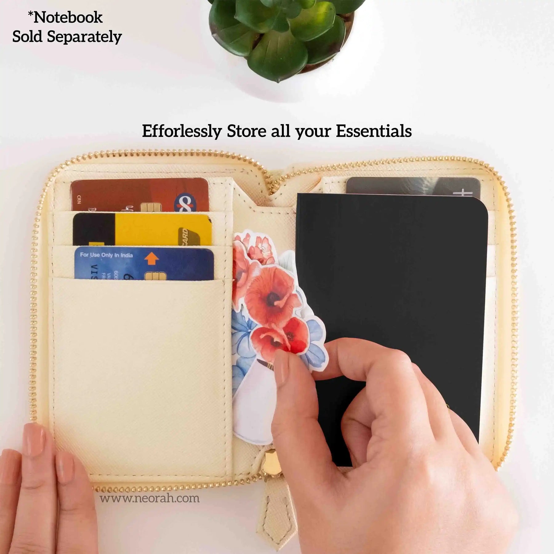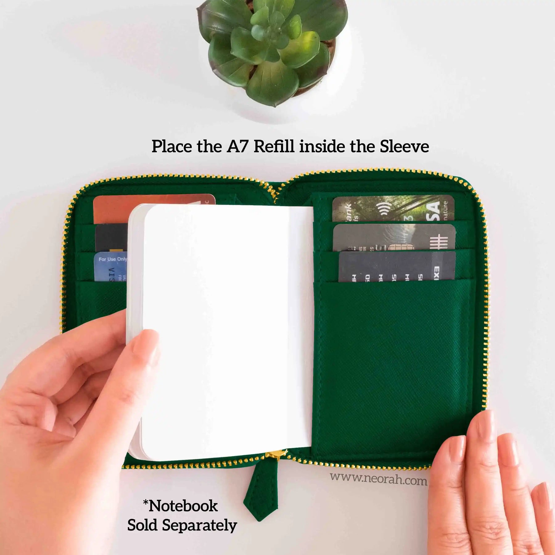 [ HANDCRAFTED TO PERFECTION ] This Journal cover is handcrafted with double panelled Vegan Leather that makes it a sturdy and reliable companion. The Journal Organiser has golden metallic zippered closure a compartment to insert any one replaceable A7 Soft Cover Journal 1 side compartment for stickers, bills or receipts 6 card slots a Wallet Space for cash, ticket etc.