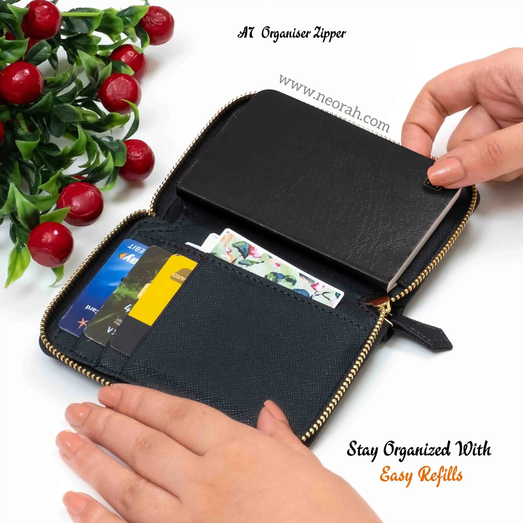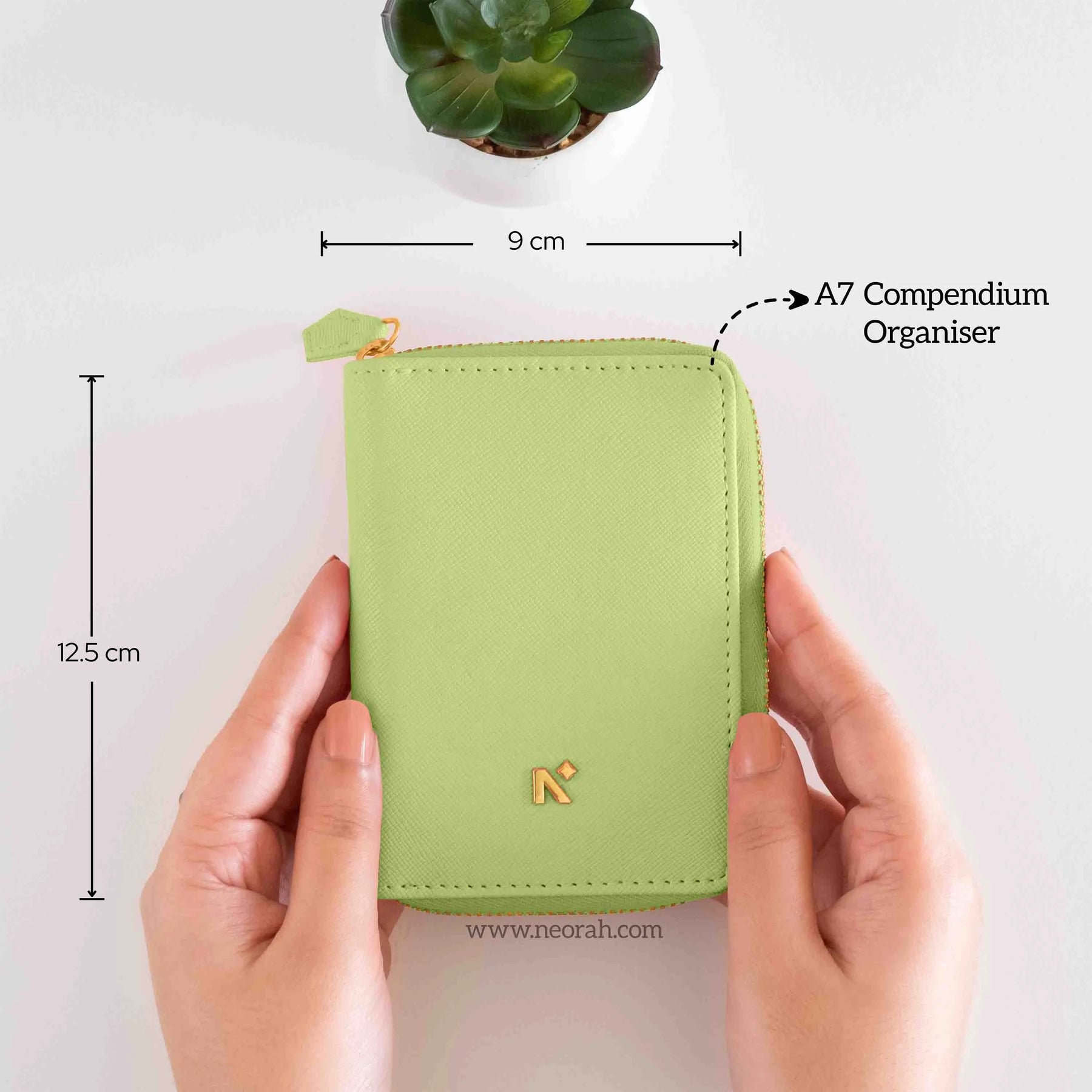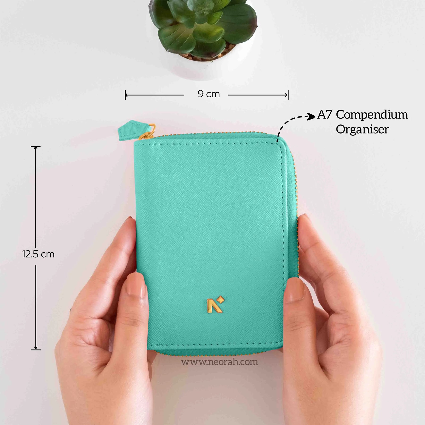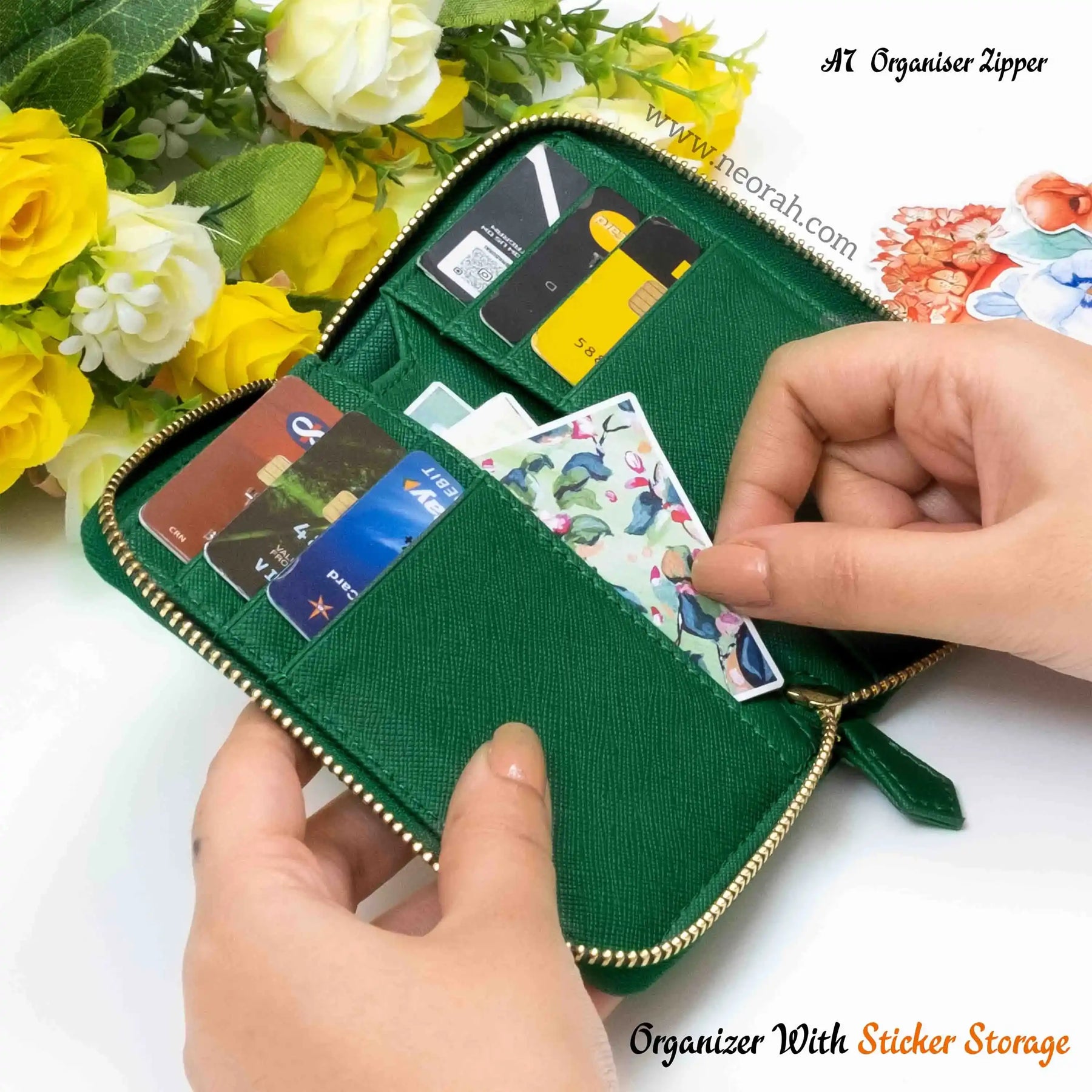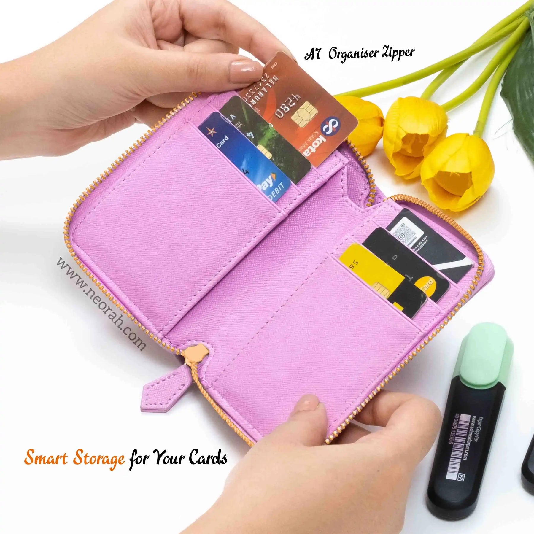 [ HANDCRAFTED TO PERFECTION ] This Journal cover is handcrafted with double panelled Vegan Leather that makes it a sturdy and reliable companion. The Journal Organiser has golden metallic zippered closure a compartment to insert any one replaceable A7 Soft Cover Journal 1 side compartment for stickers, bills or receipts 6 card slots a Wallet Space for cash, ticket etc.