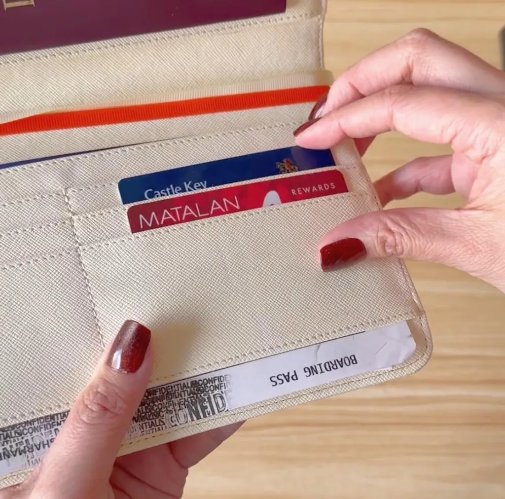 Functions as a wallet by storing your debit cards, credit cards, id cards, currency and other important receipts, bills and tickets.