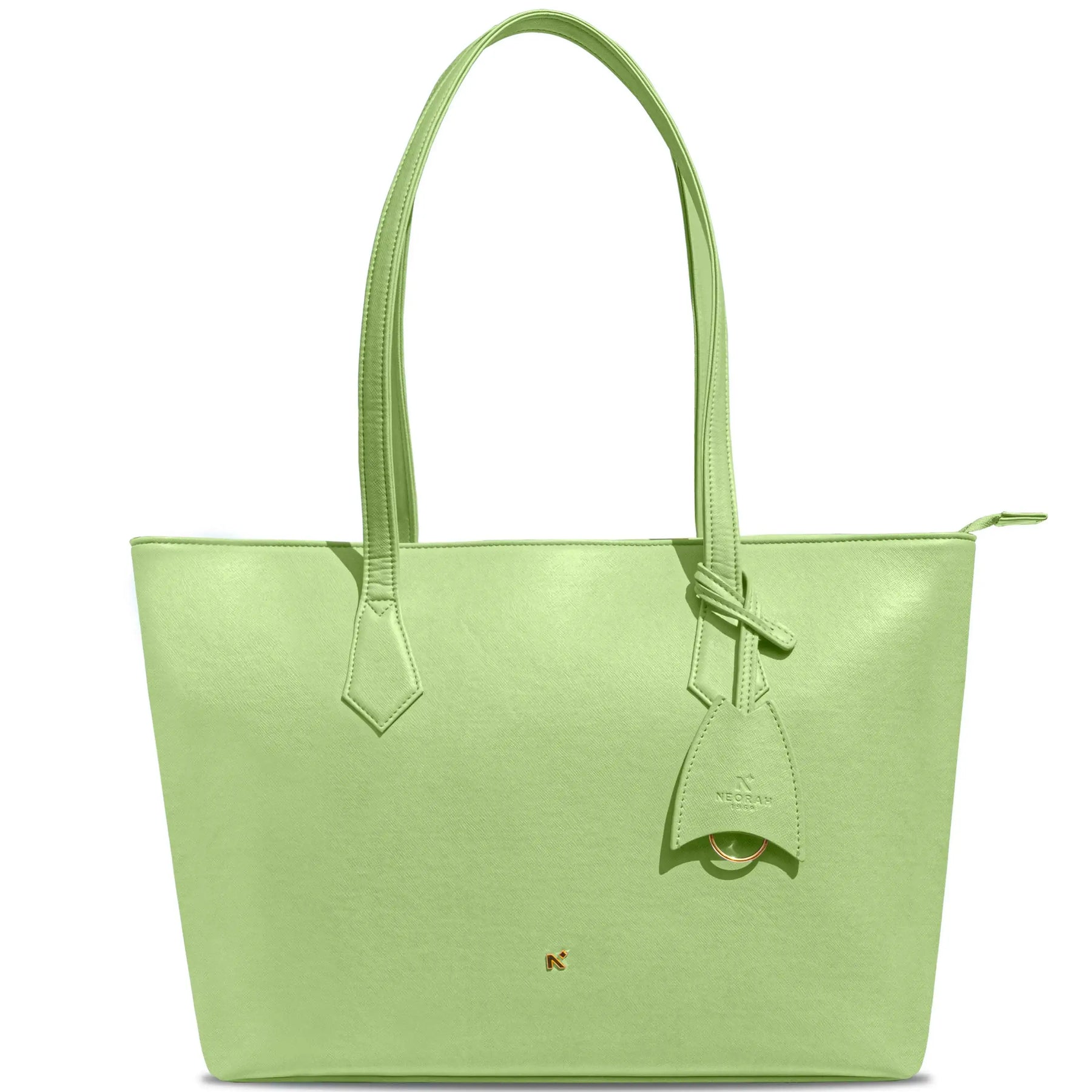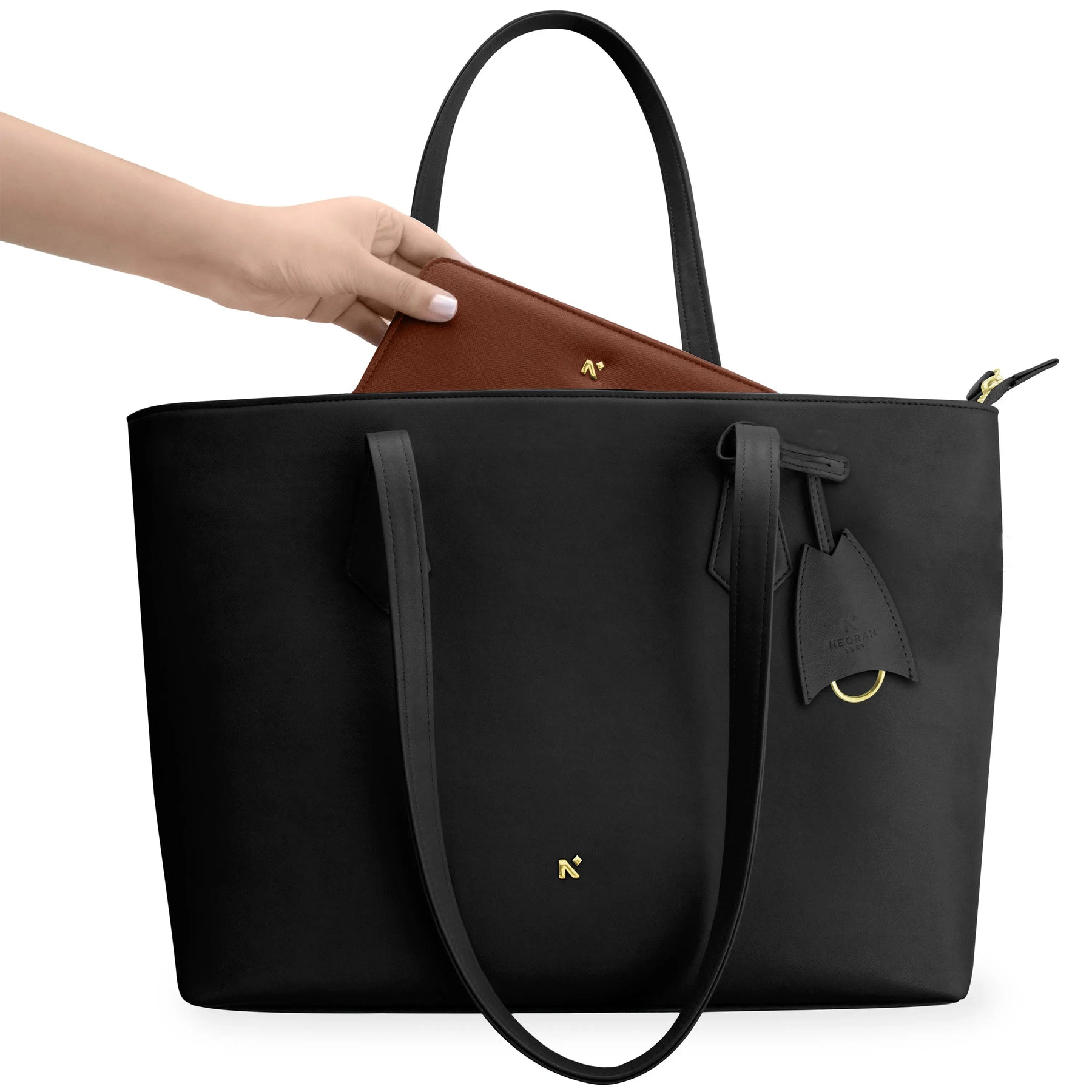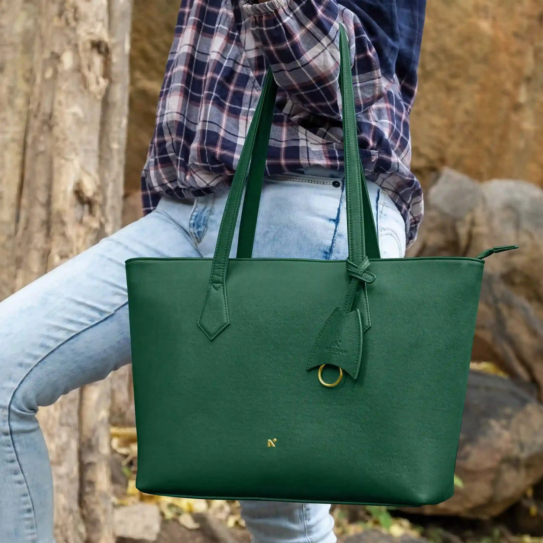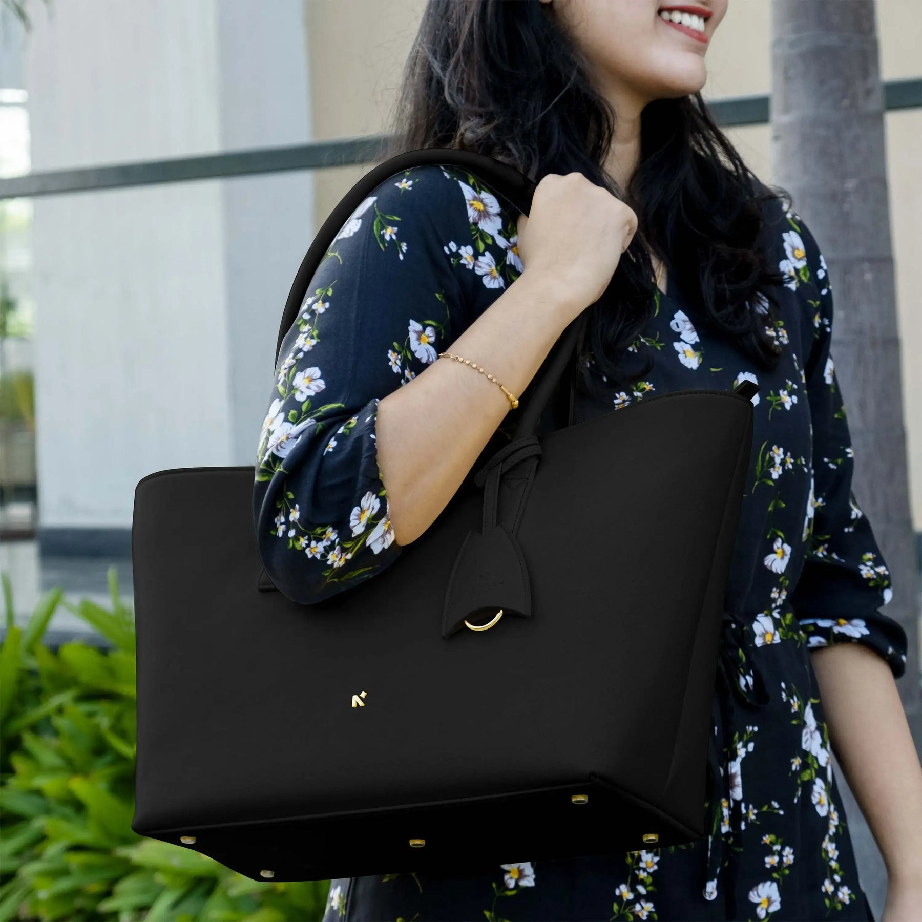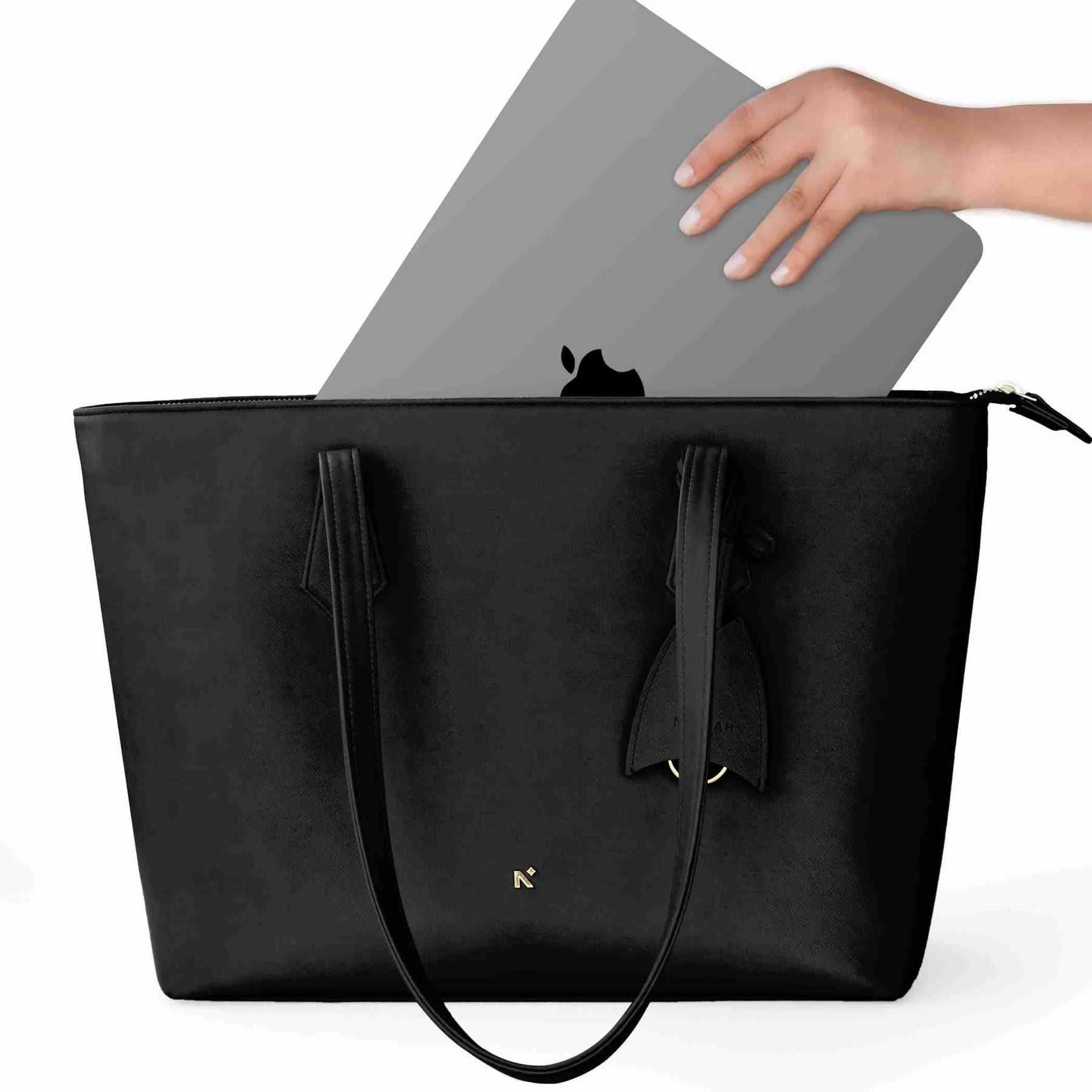 [HANDCRAFTED TO PERFECTION] Fine crafted with vegan leather, this tote bag is lined with silk blend material on the inside to protect your valuables. A large spacious interior featuring a dedicated laptop sleeve with strap closure  Side pocket  Back pouch on the outside Metal studs at the bottom that prevent the bag from getting dirty