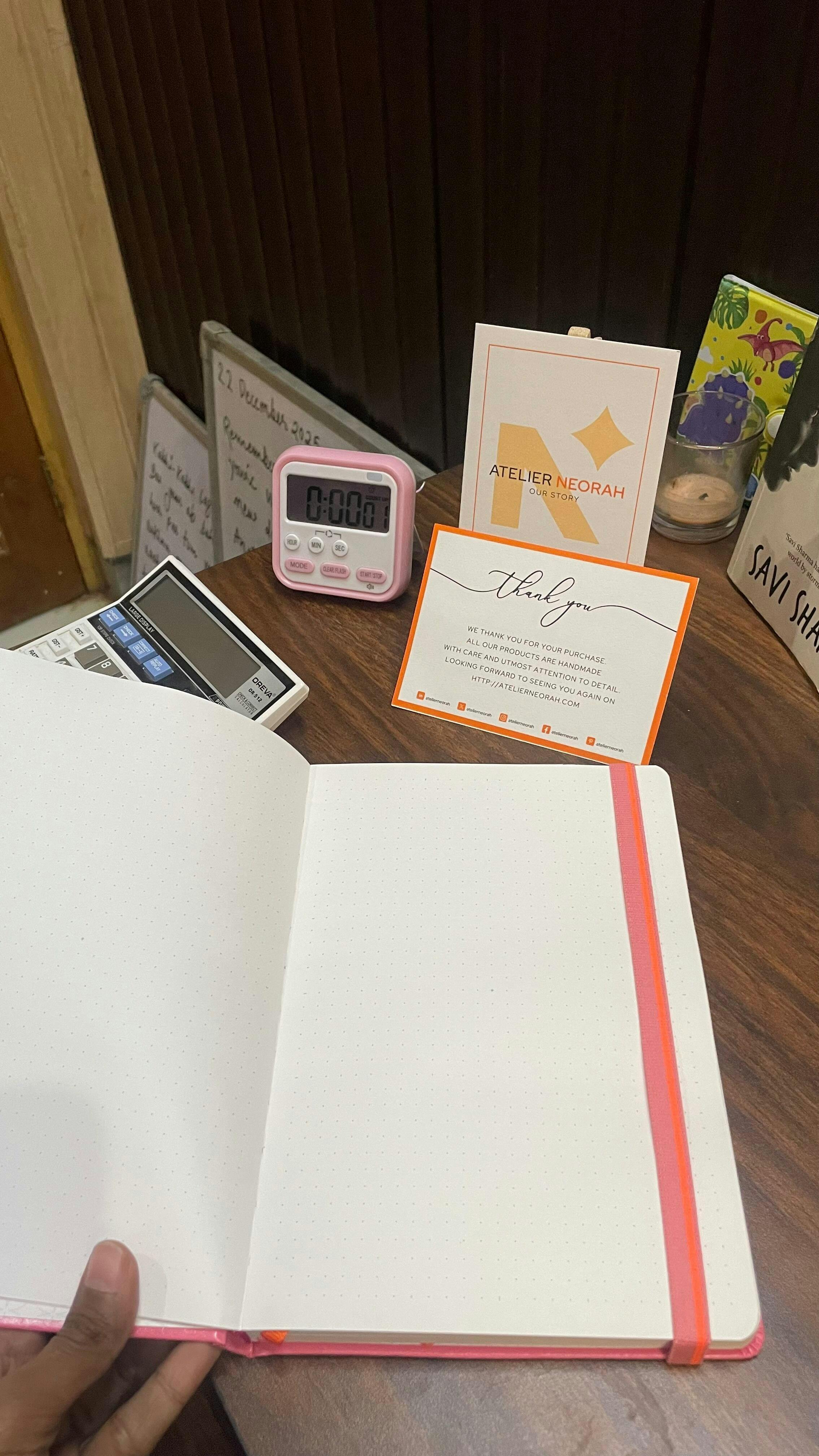 The Atelier Neorah journal exceeded my expectations. The vegan leather cover feels premium, and the 110 GSM acid-free pages are thick and smooth perfect for writing with zero bleed-through. The notebook opens flat, has great build quality, and complements my journaling setup beautifully. Definitely a great choice for anyone who loves good stationery!