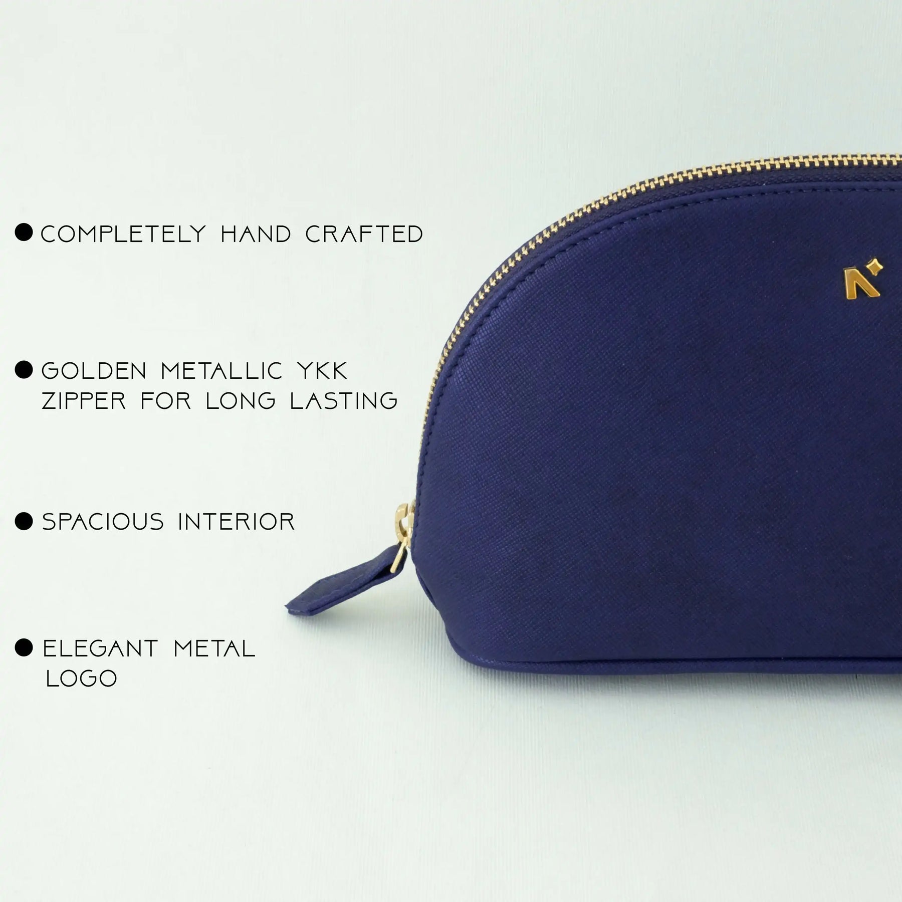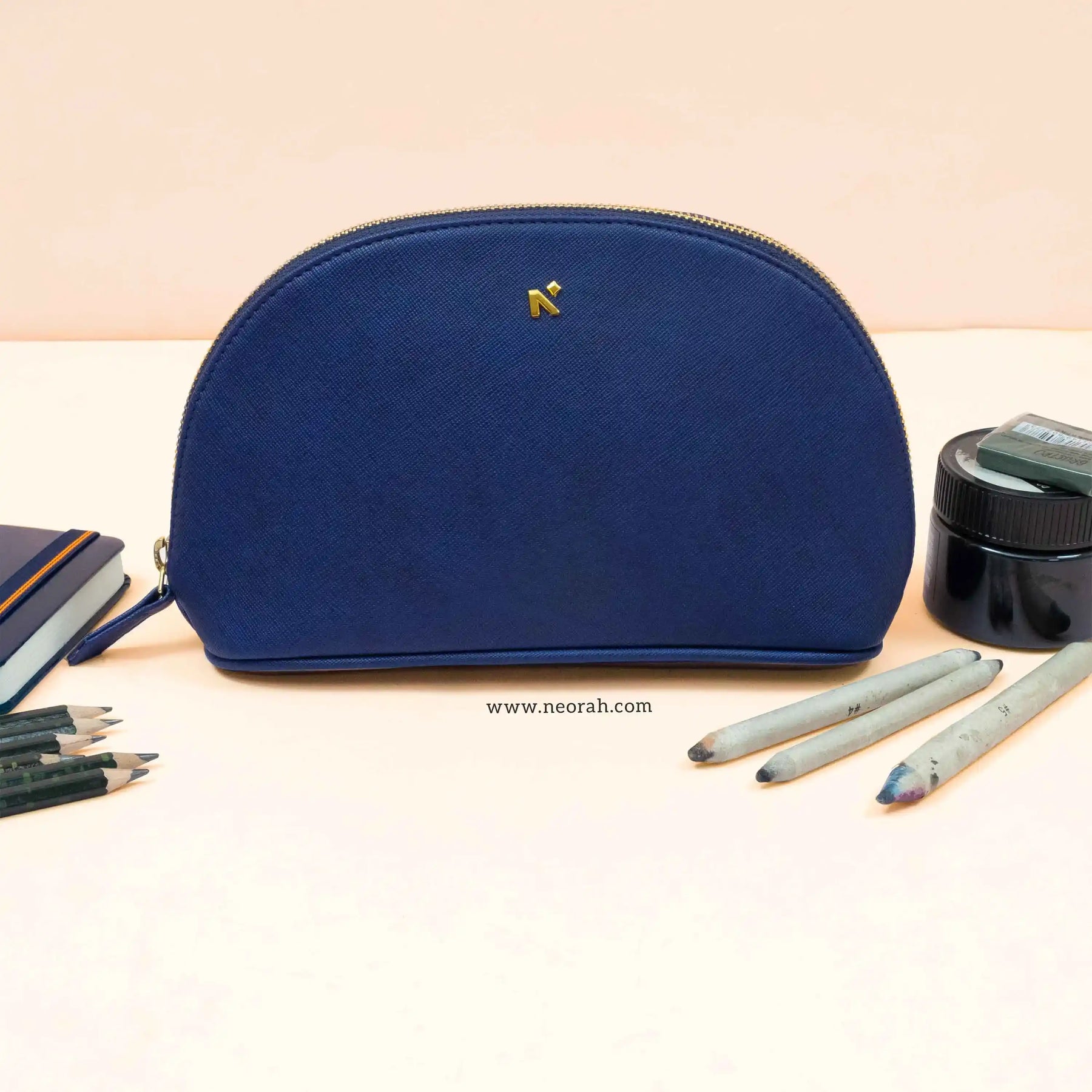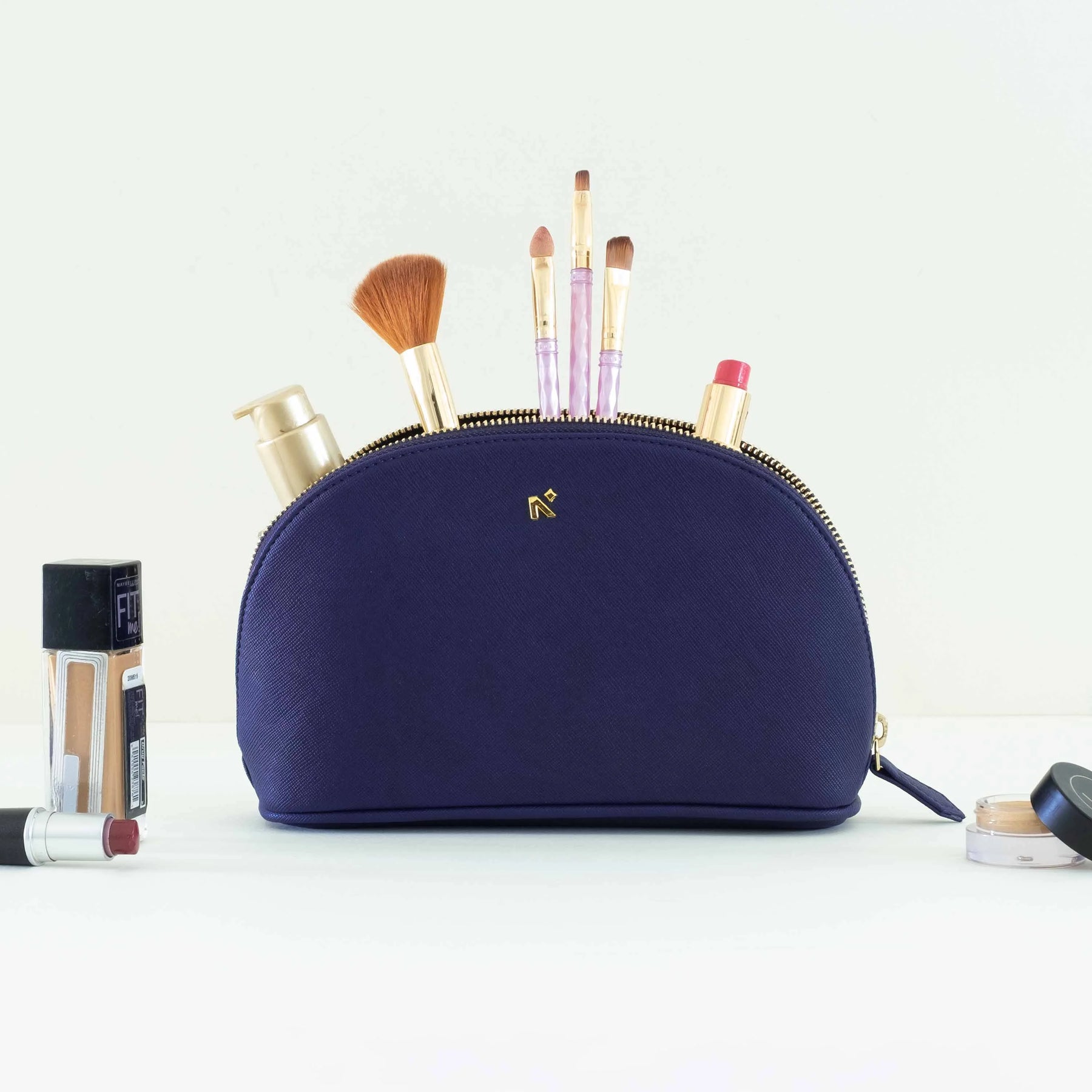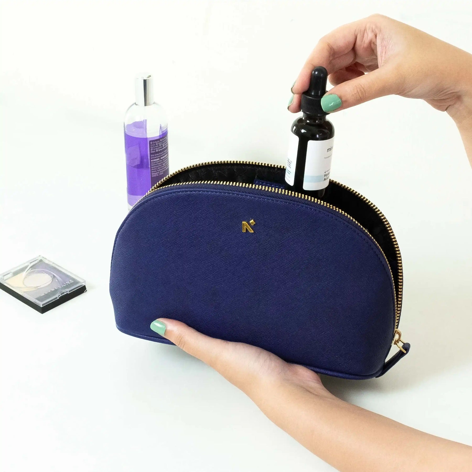 Neorah cosmetic pouch for travel, Best Makeup Bag, Designer makeup pouches to carry everyday makeup skincare and essentials for travel. #color_dark-blue