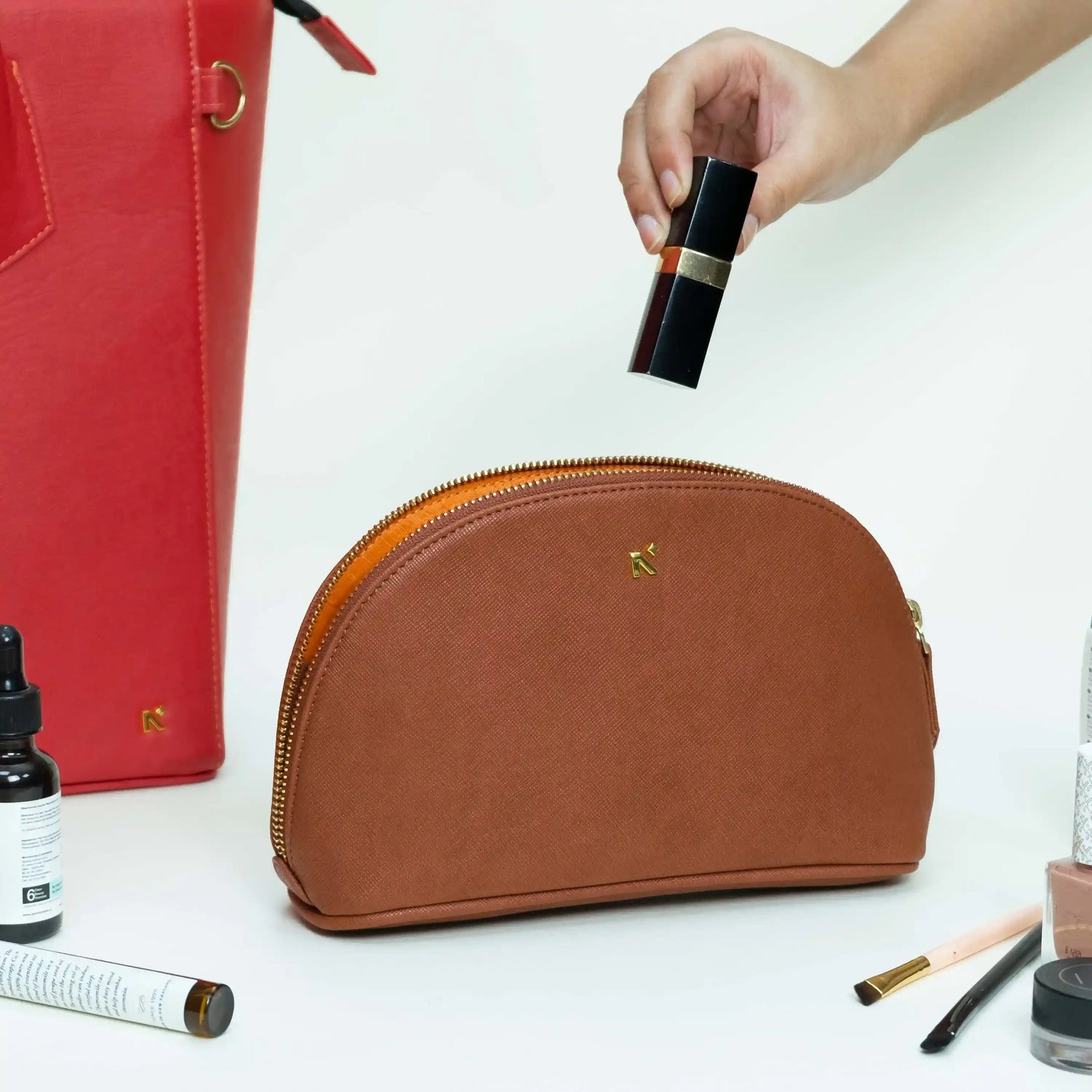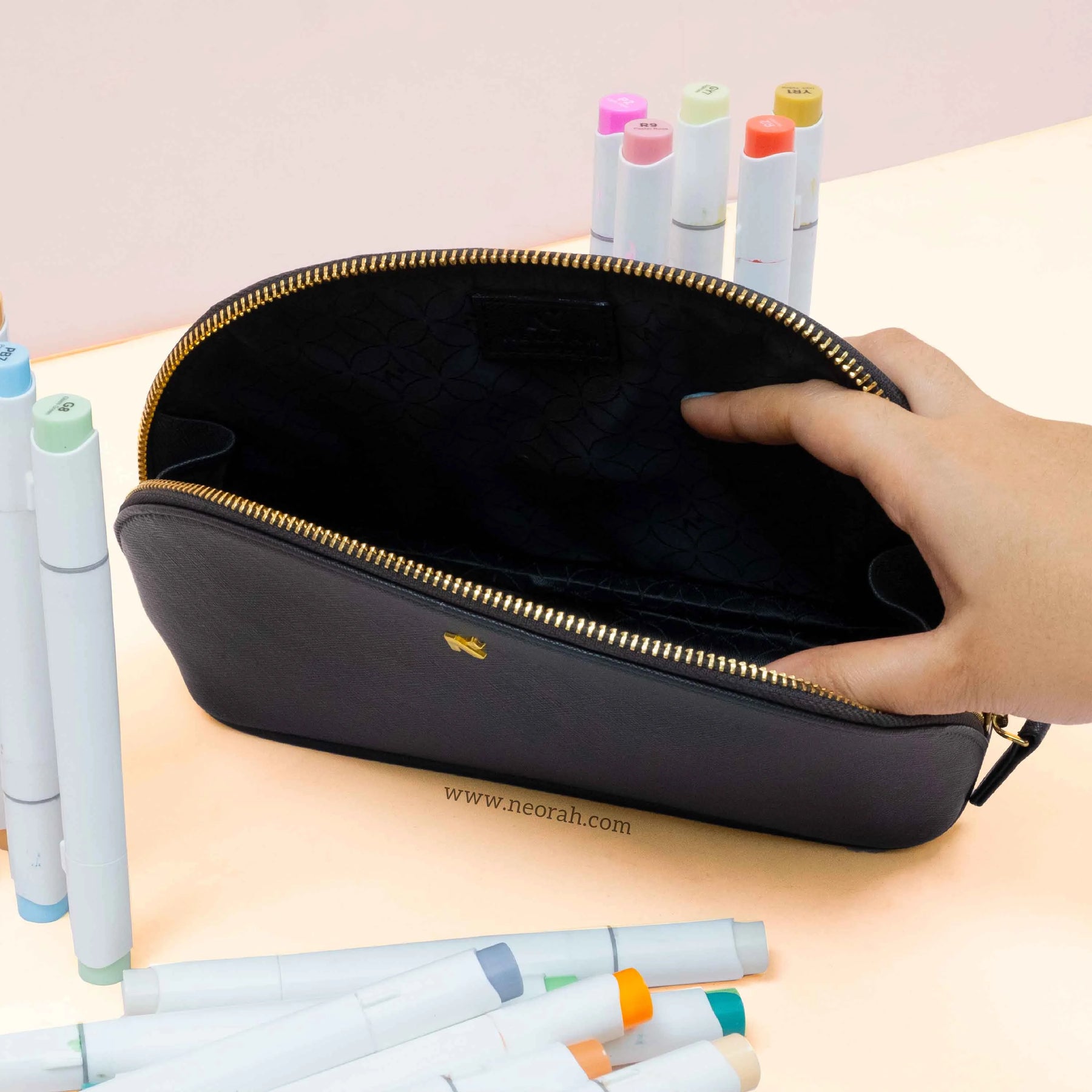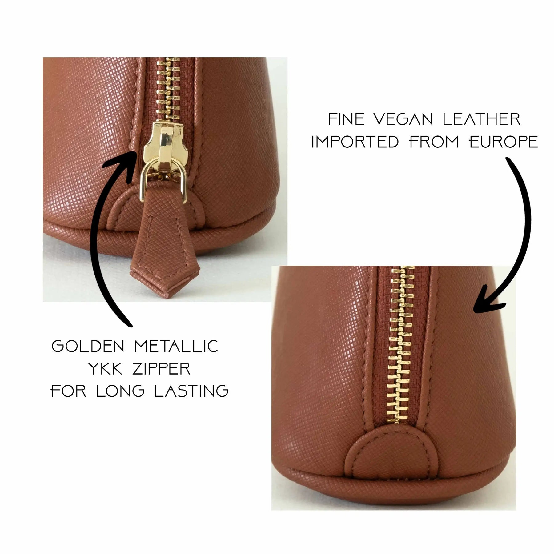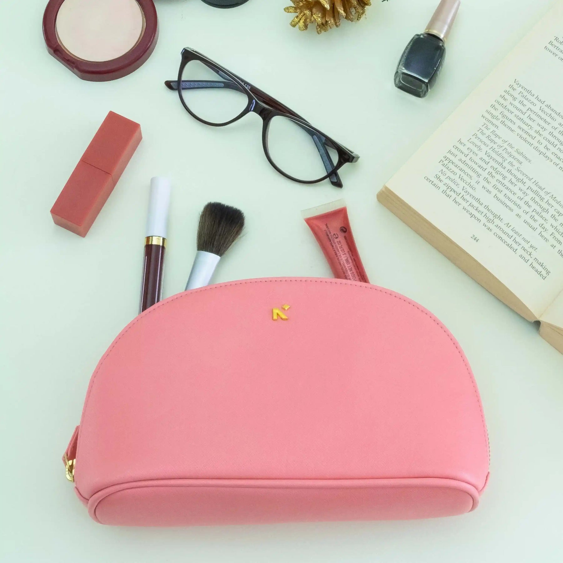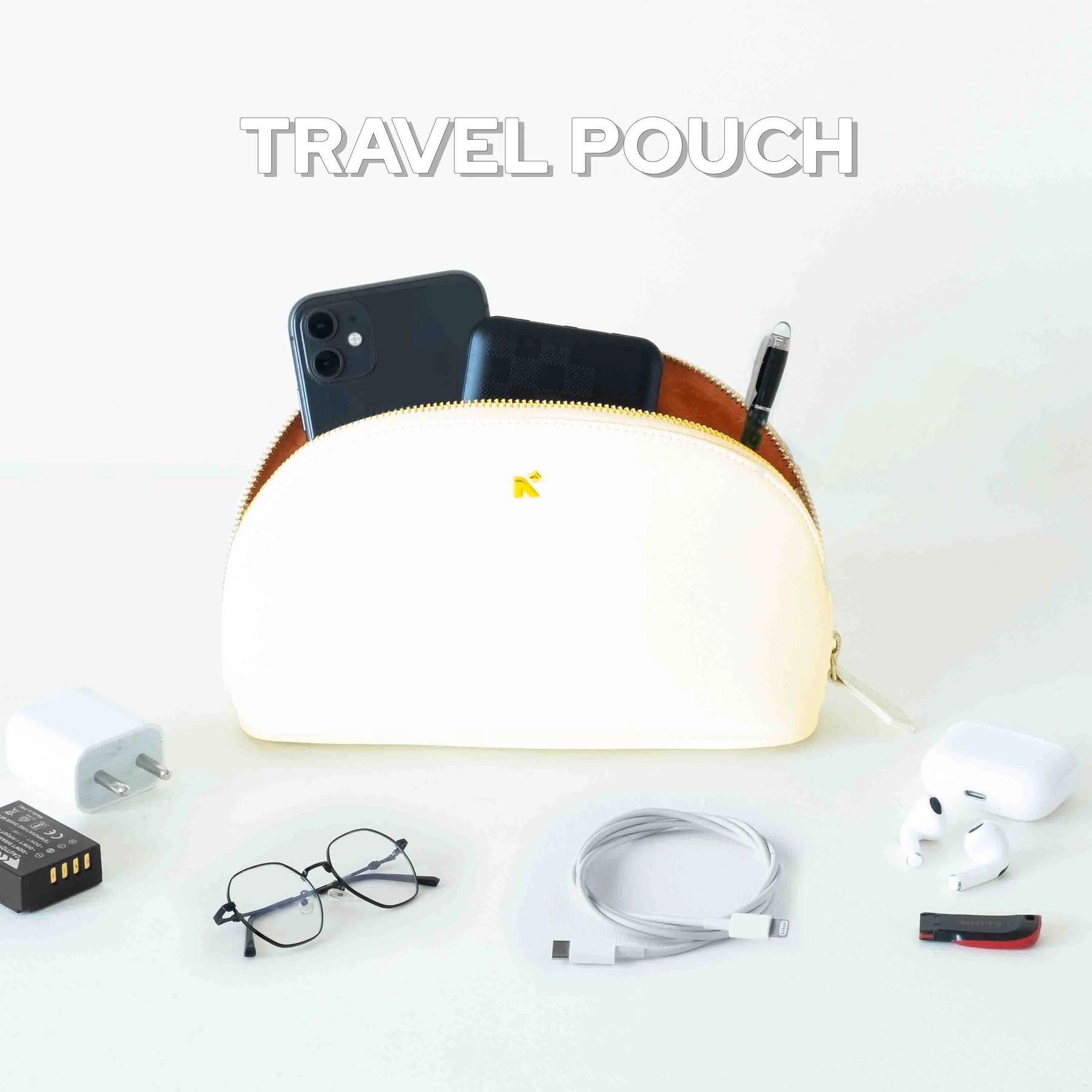 [IDEAL PORTABLE CASE] The stylishly compact half-moon pouchette makes it easy to slip in your handbags, totes, travel bags and pack in suitcases. Durable, Lightweight, Waterproof with highest standard workmanship.