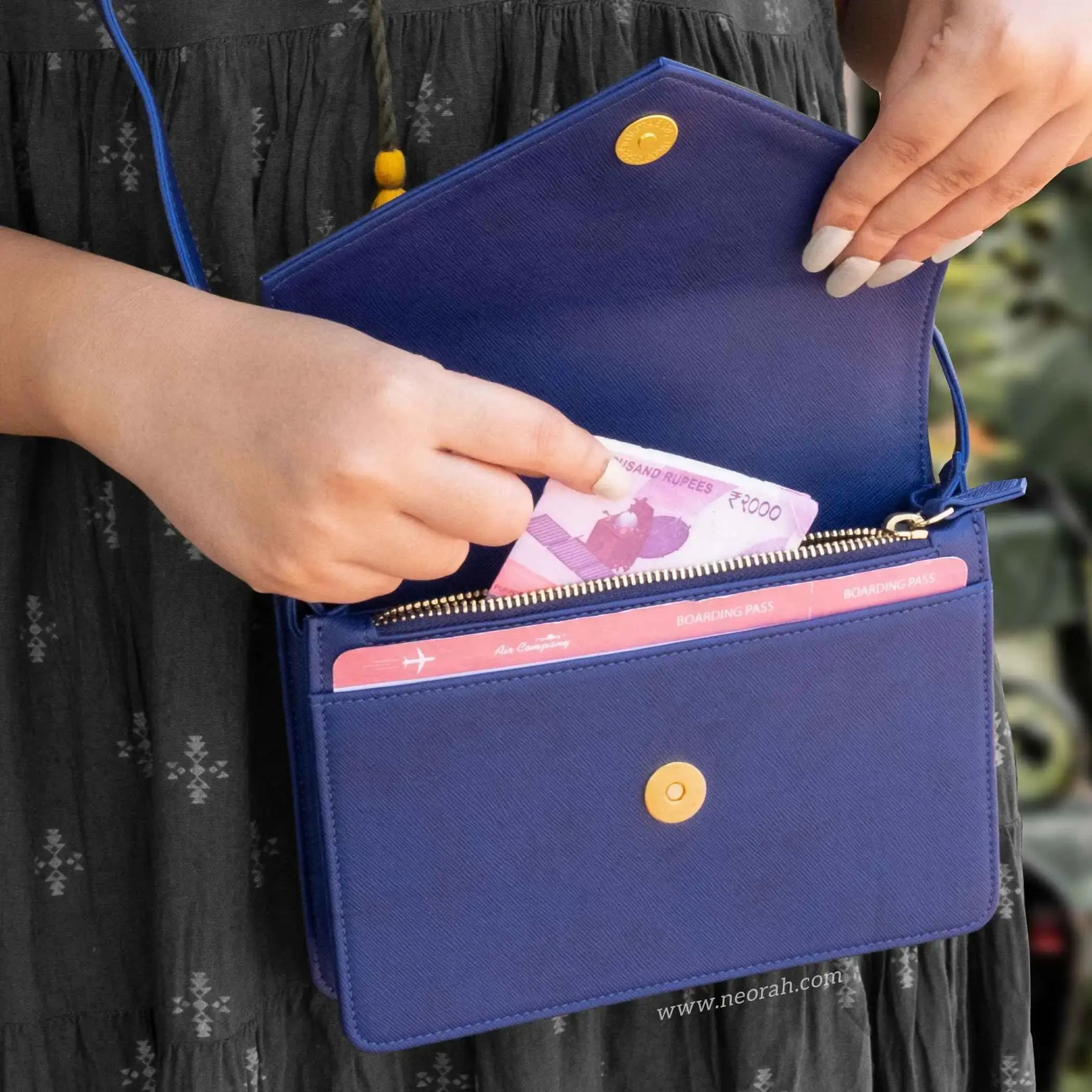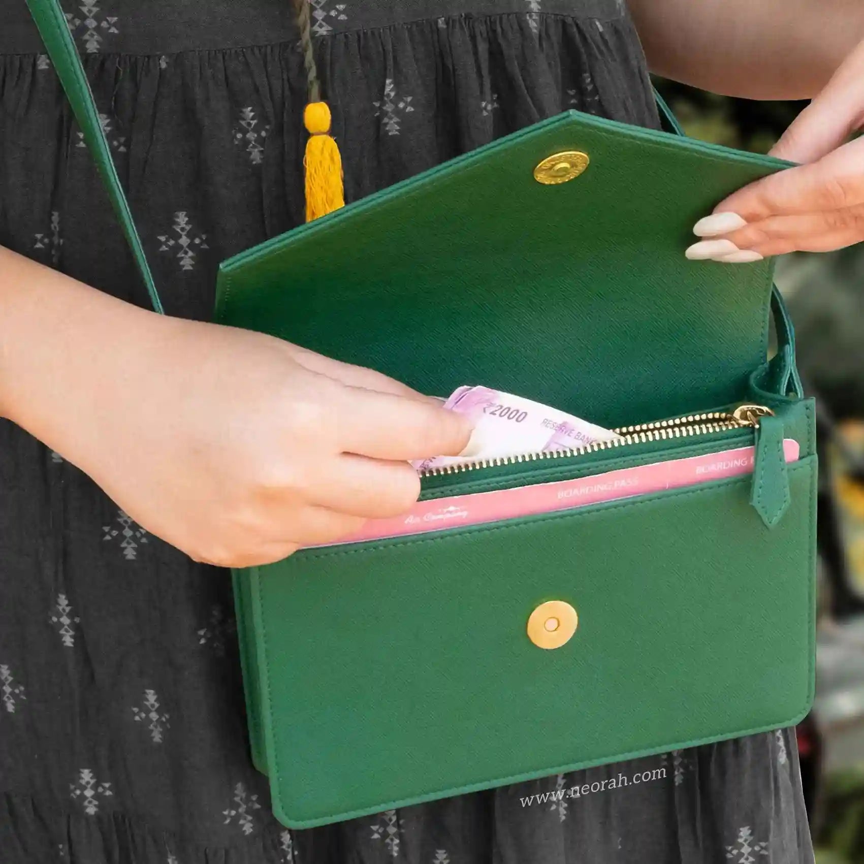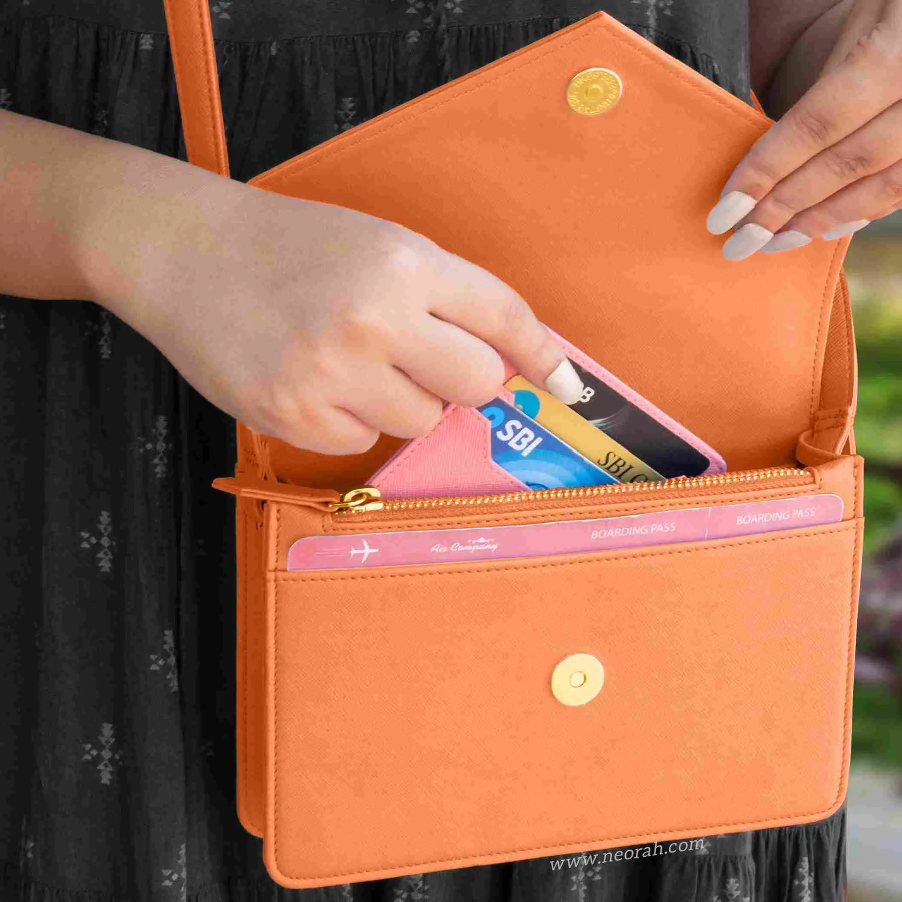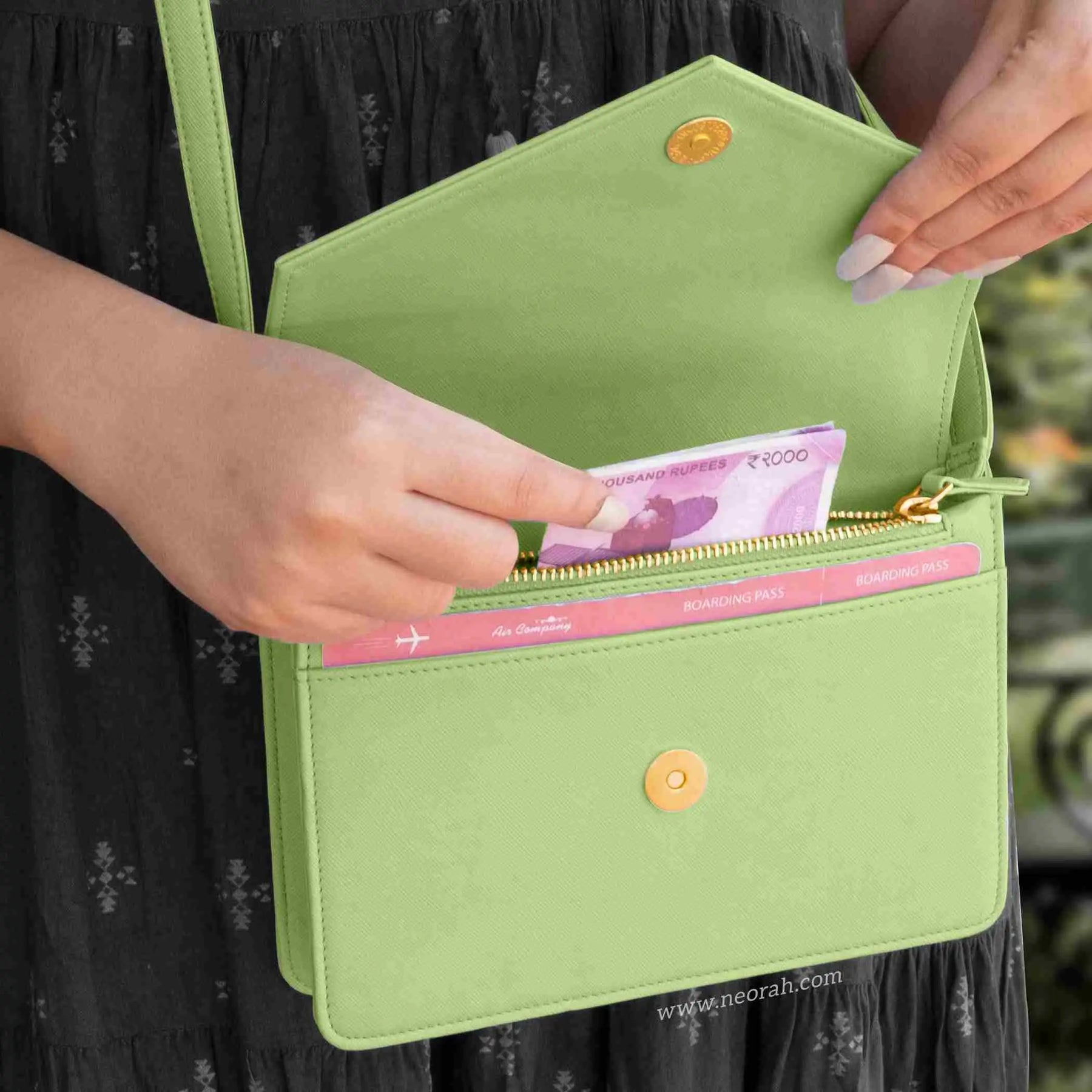 [HANDCRAFTED TO PERFECTION] Fine crafted with vegan leather and sports an organised and spacious interior. It has an envelope flap with gold toned magnetic closure and lined with silk-blend material to protect your valuables. Features: Front pocket for bills, receipts, boarding pass tickets etc Front zipped compartment for currency and valuables 6 card slots Inner pocket for passport and other documents Spacious main compartment Back pouch for mobile