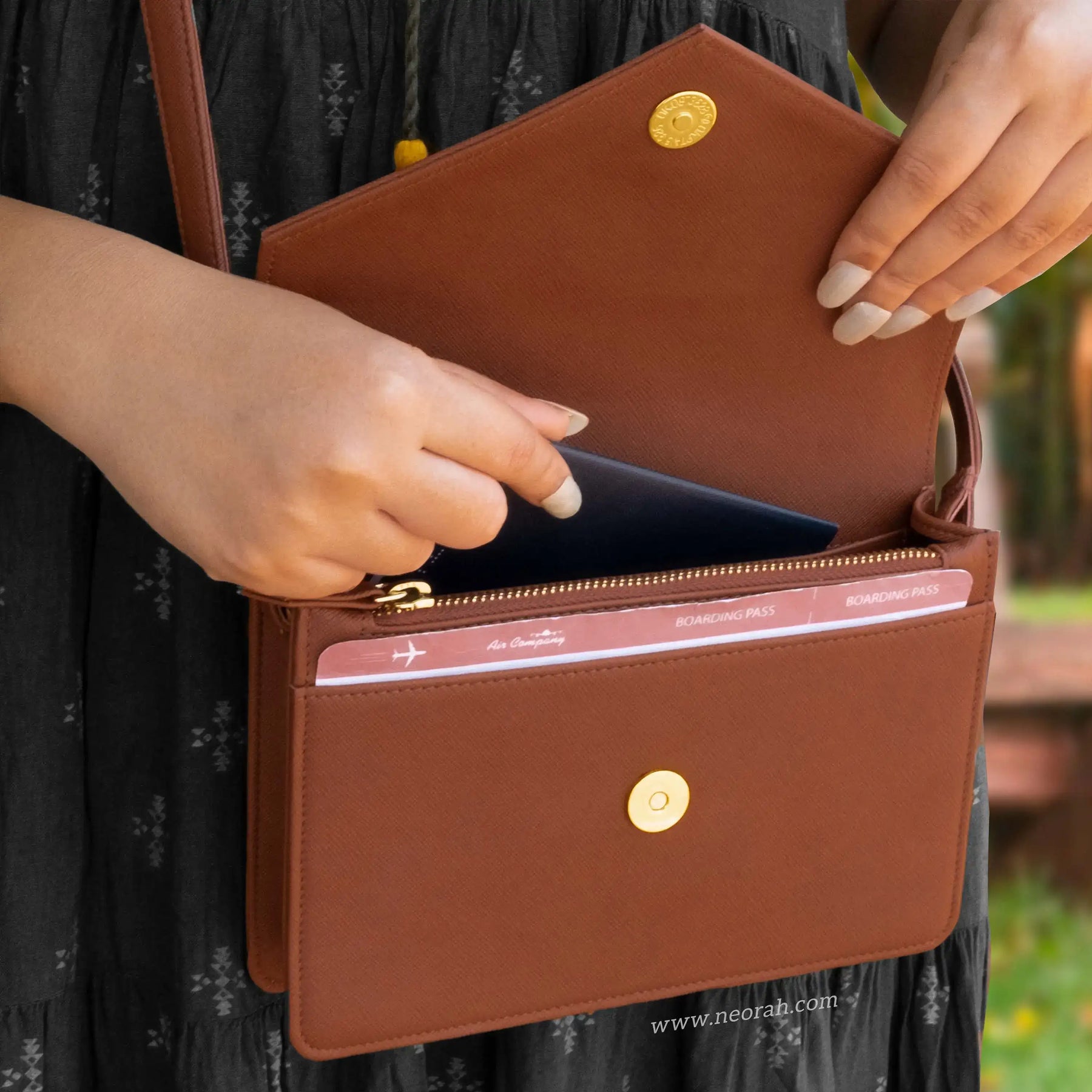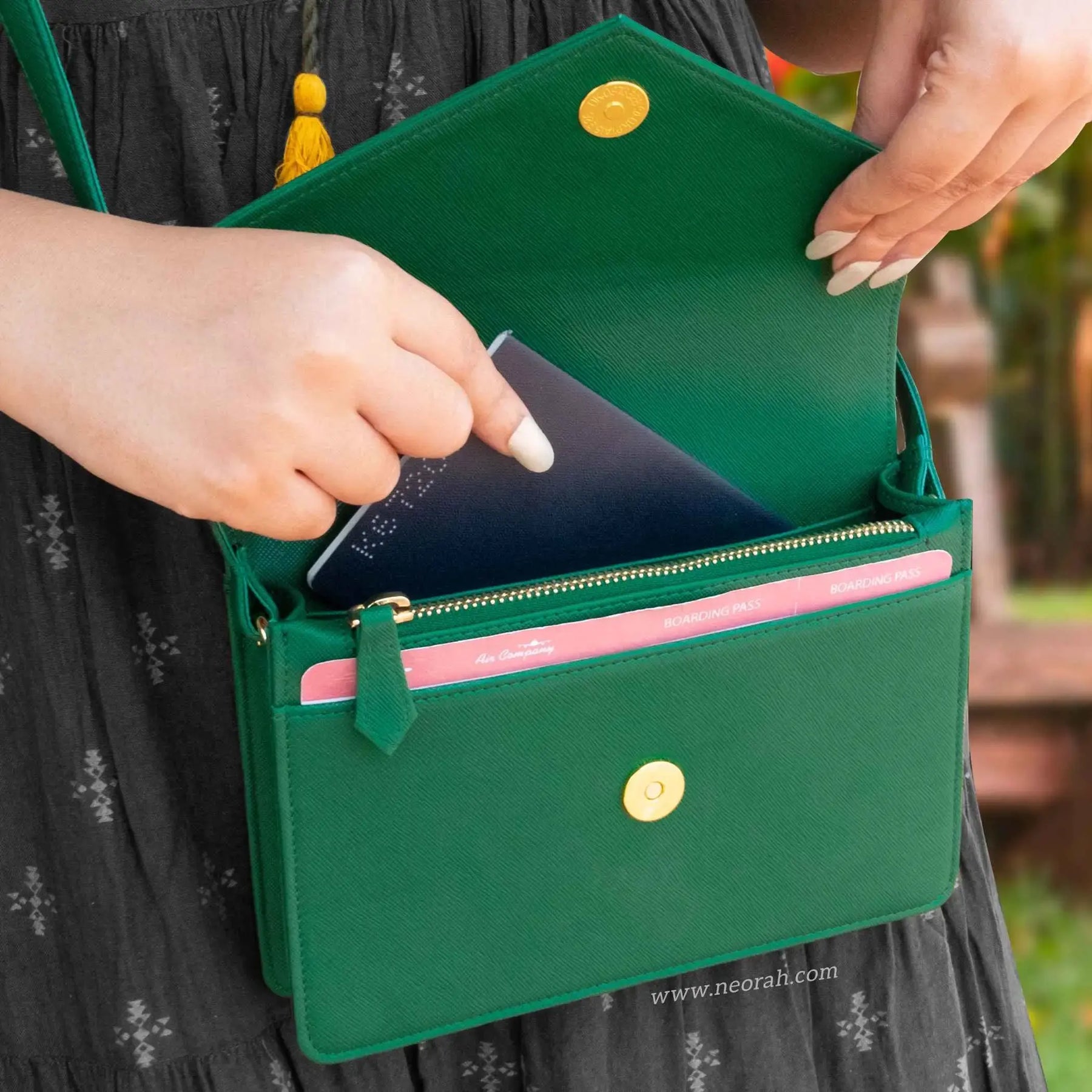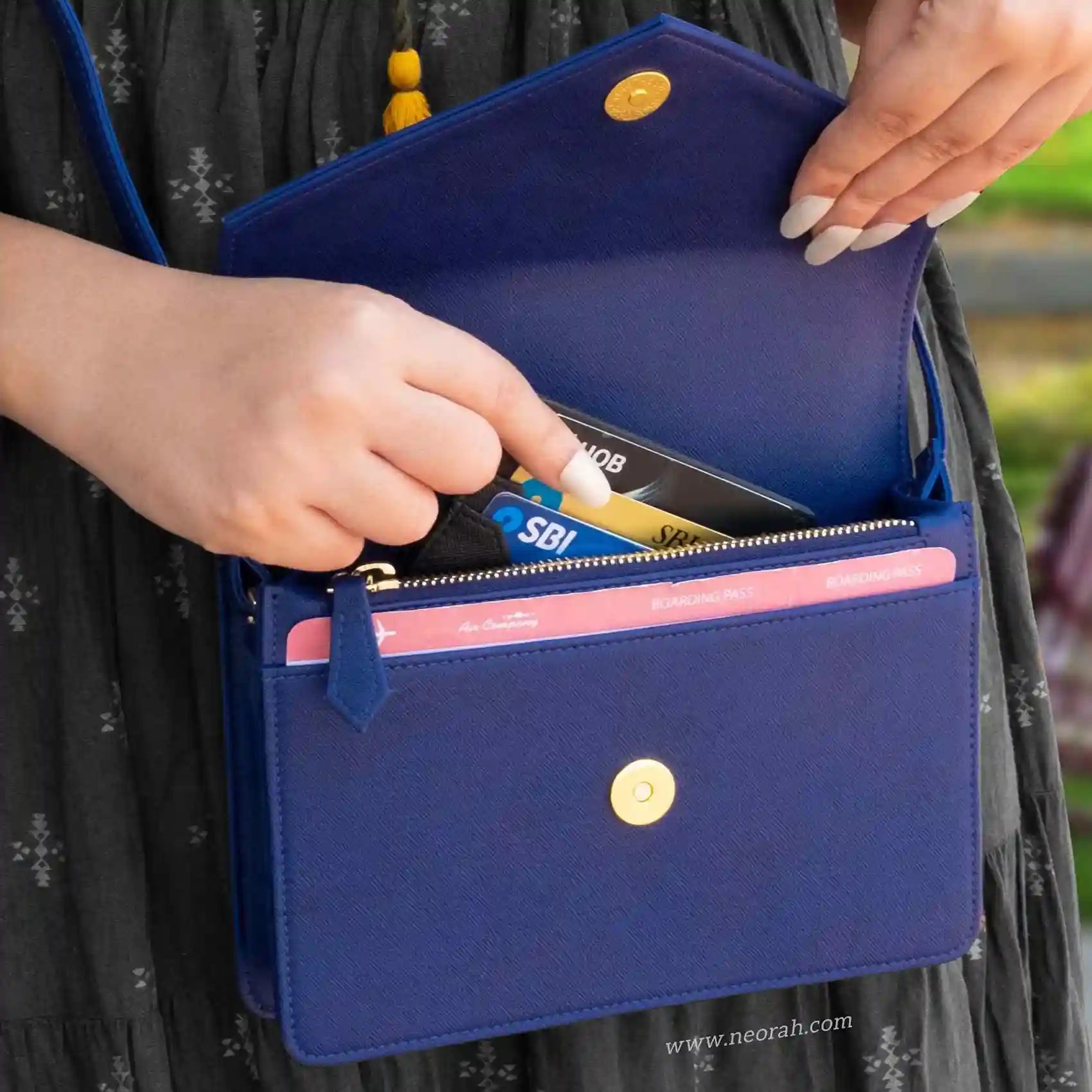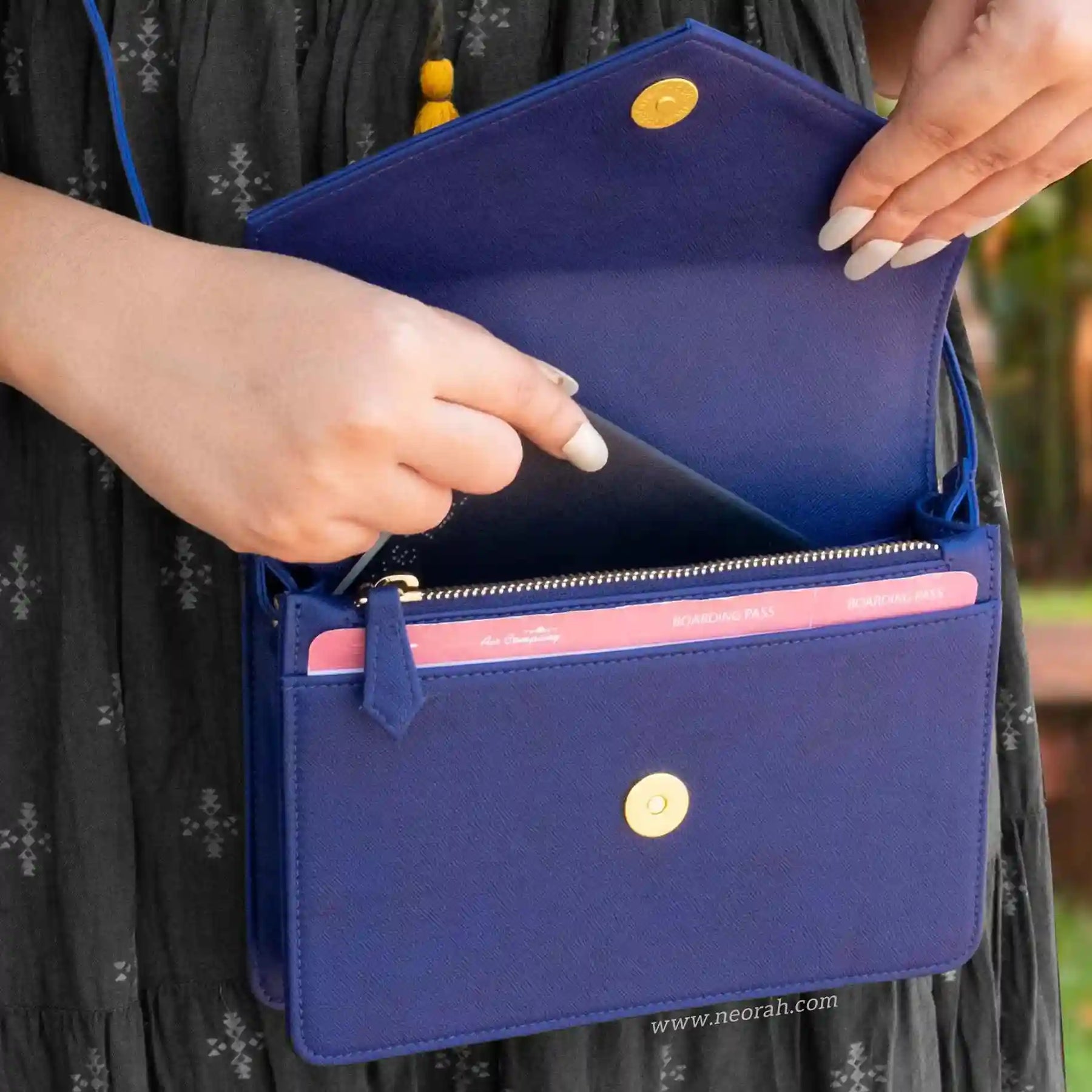 [HANDCRAFTED TO PERFECTION] Fine crafted with vegan leather and sports an organised and spacious interior. It has an envelope flap with gold toned magnetic closure and lined with silk-blend material to protect your valuables. Features: Front pocket for bills, receipts, boarding pass tickets etc Front zipped compartment for currency and valuables 6 card slots Inner pocket for passport and other documents Spacious main compartment Back pouch for mobile