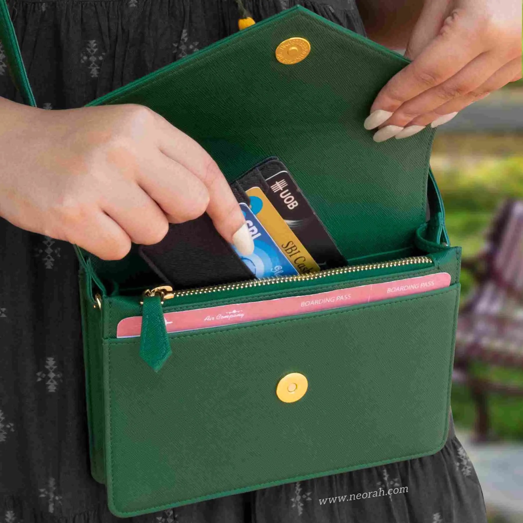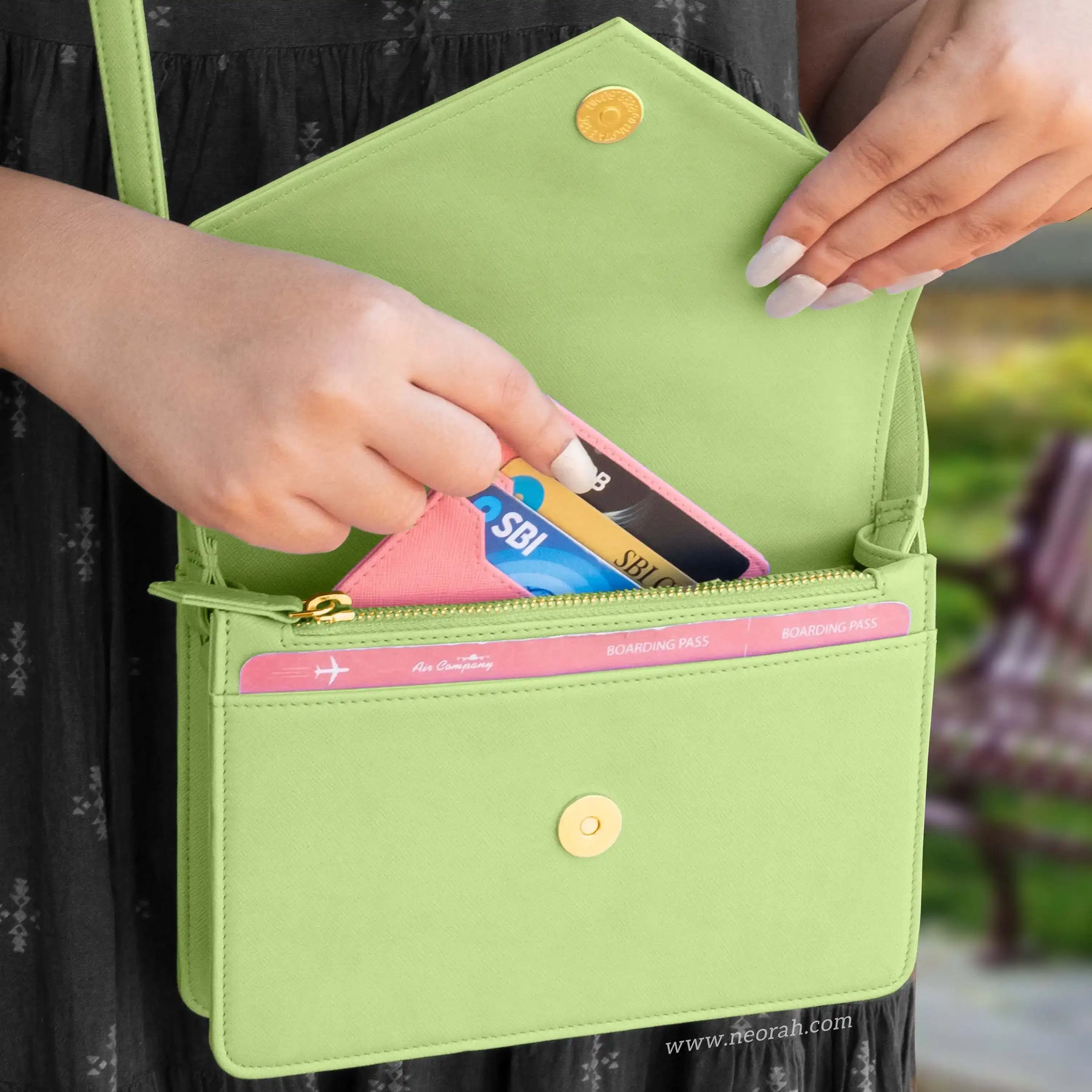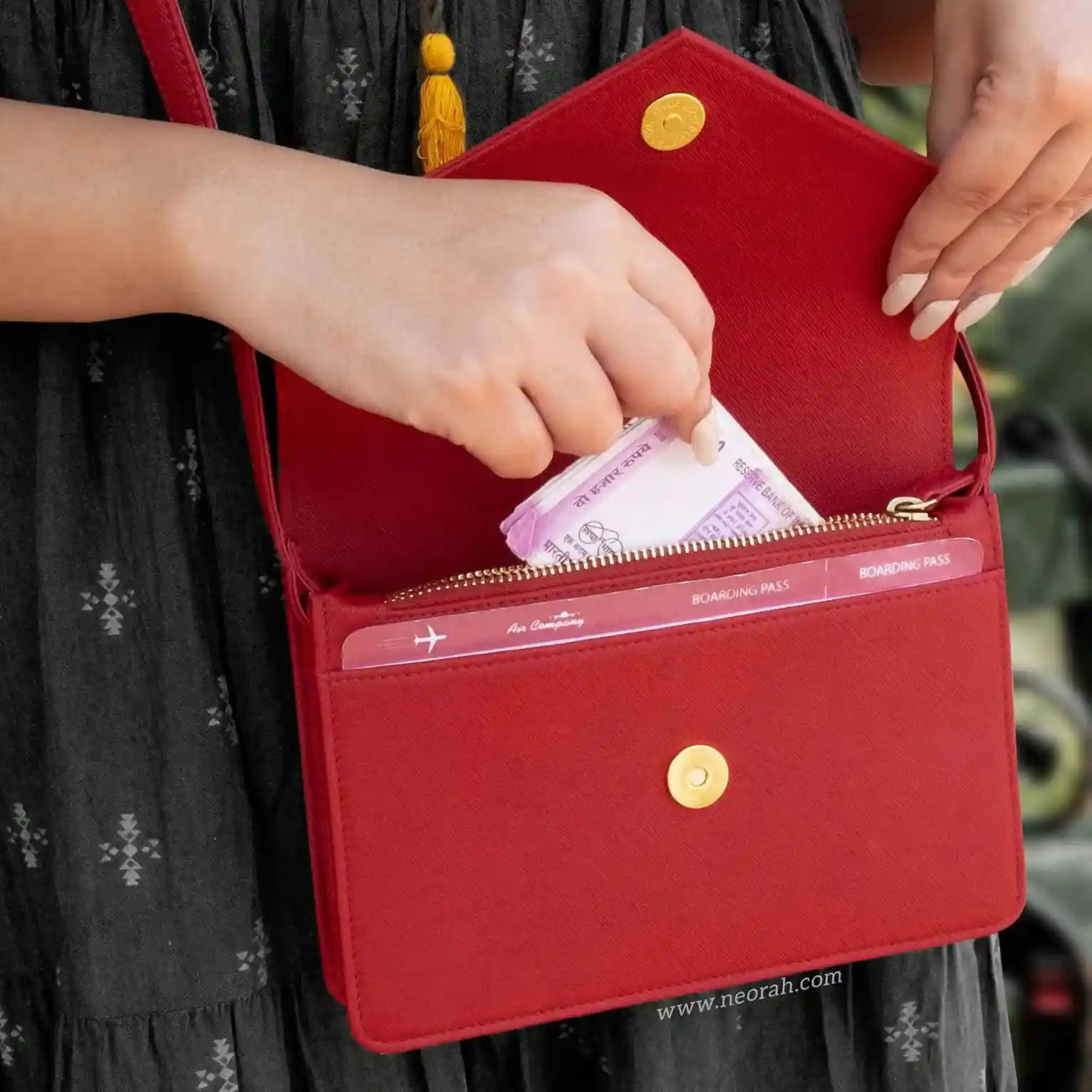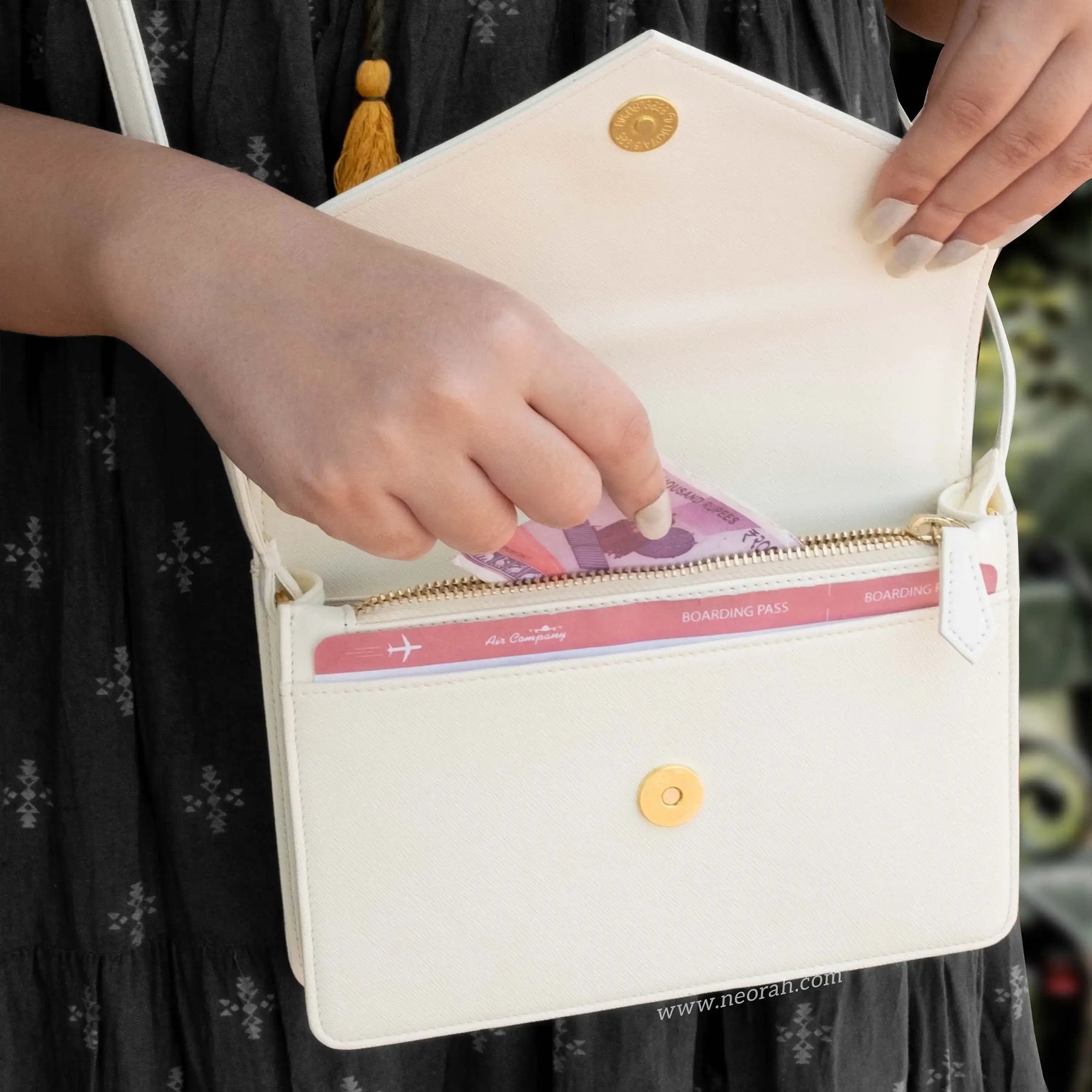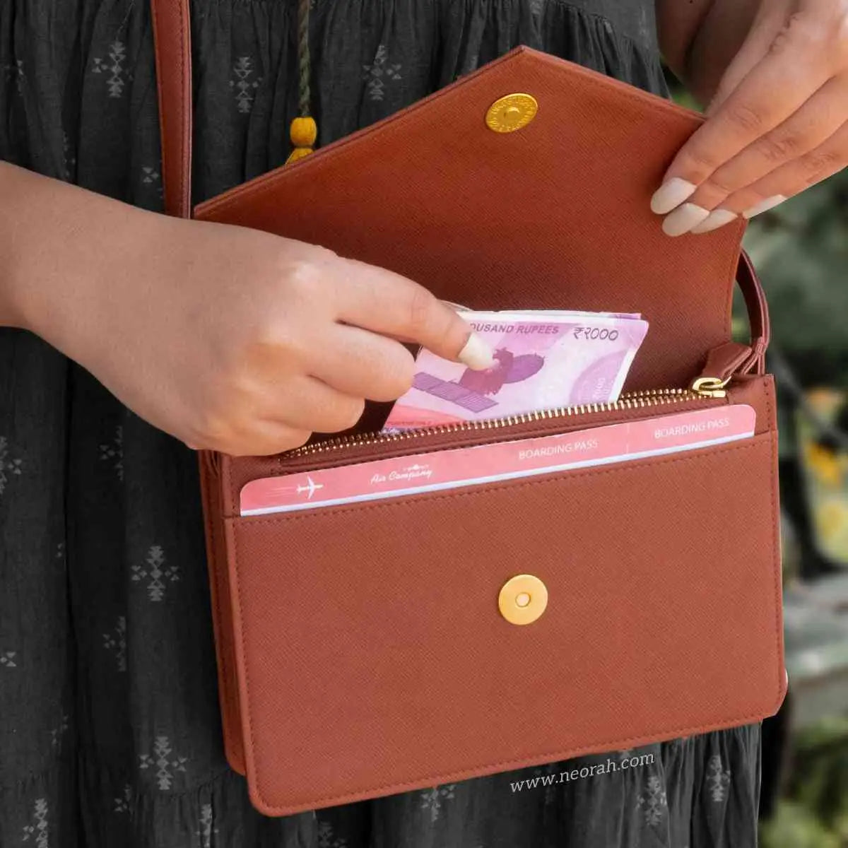 [HANDCRAFTED TO PERFECTION] Fine crafted with vegan leather and sports an organised and spacious interior. It has an envelope flap with gold toned magnetic closure and lined with silk-blend material to protect your valuables. Features: Front pocket for bills, receipts, boarding pass tickets etc Front zipped compartment for currency and valuables 6 card slots Inner pocket for passport and other documents Spacious main compartment Back pouch for mobile