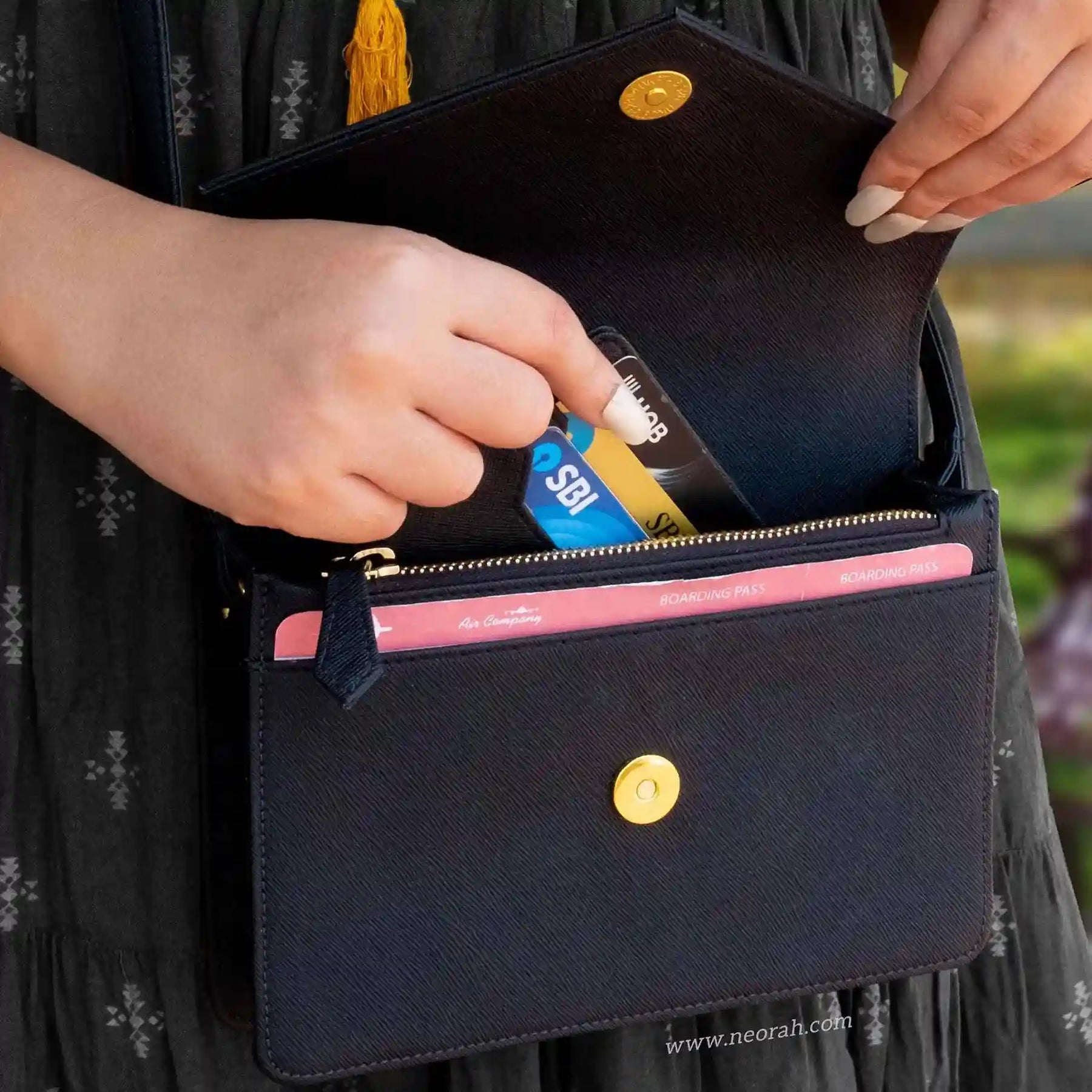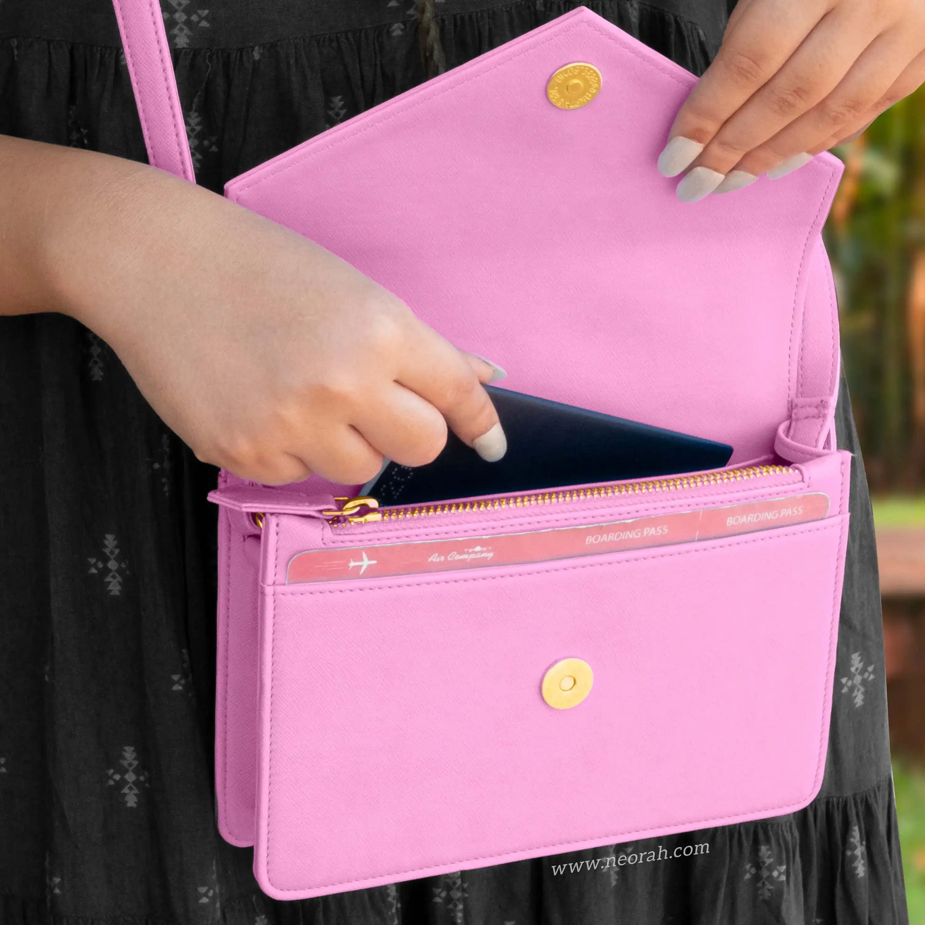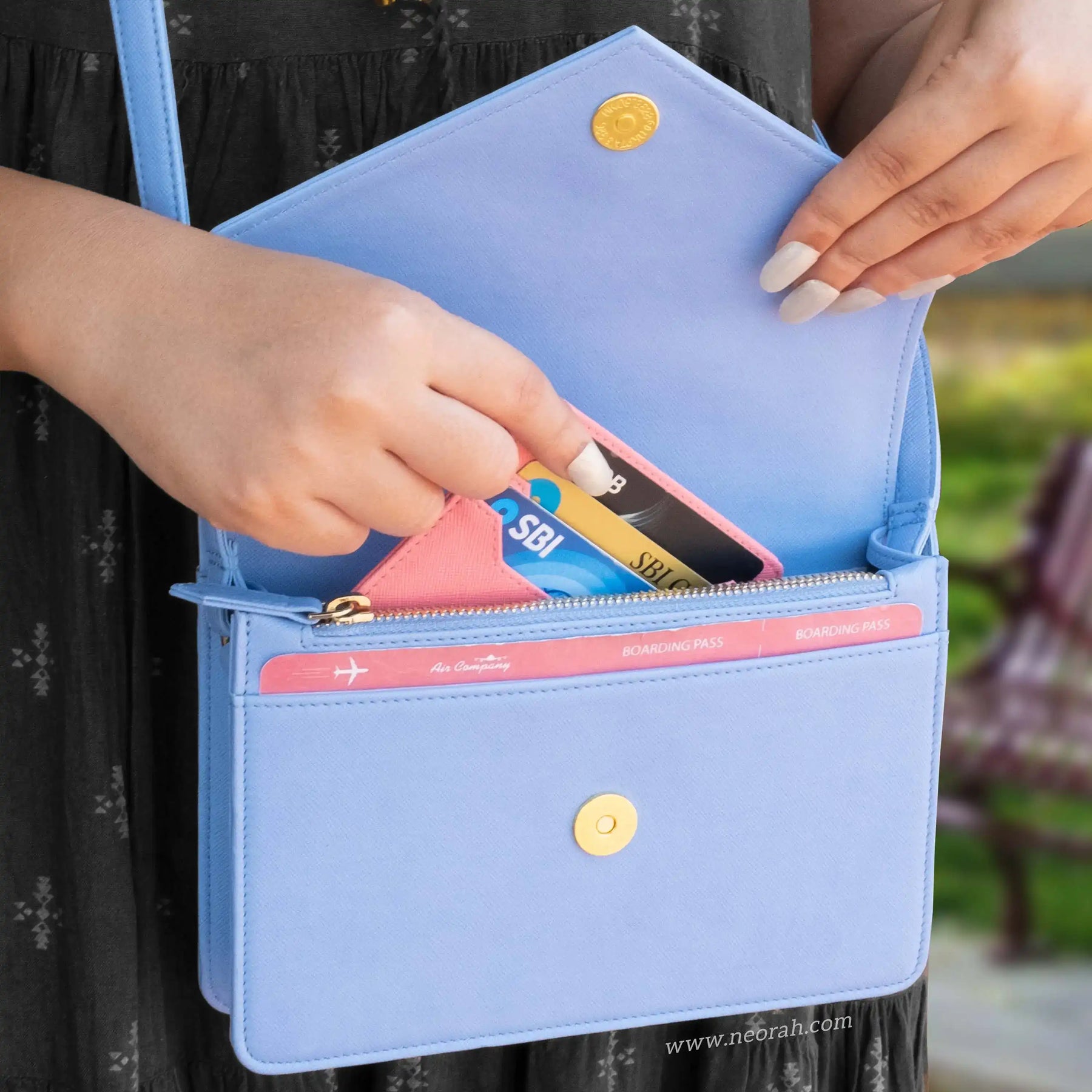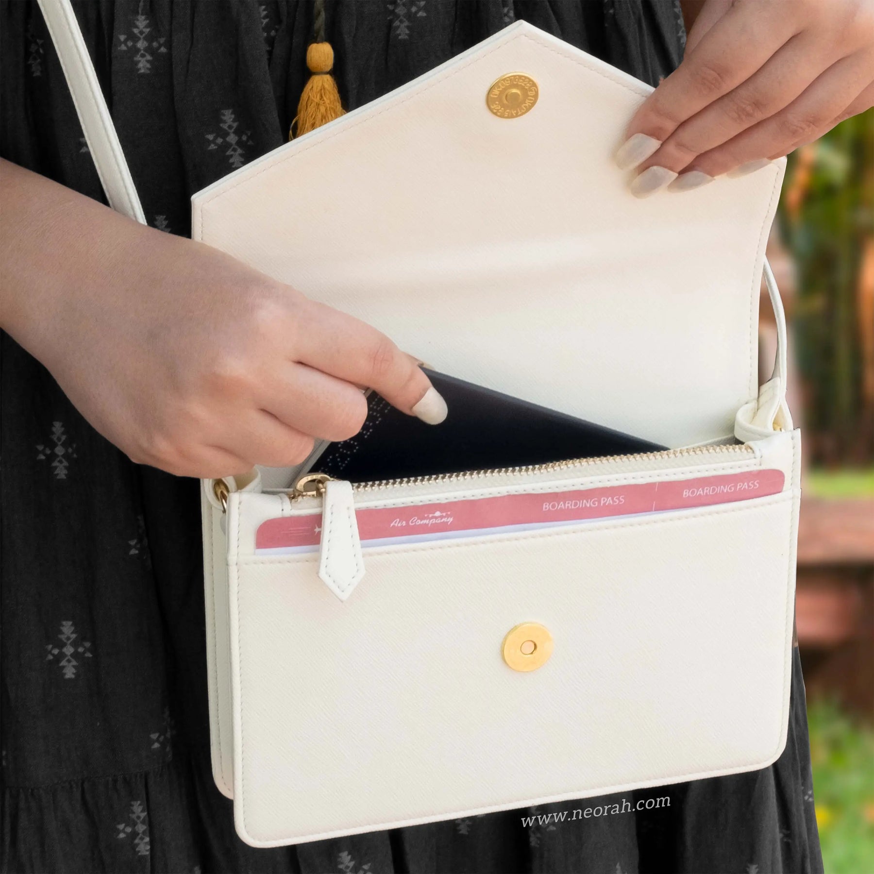 [HANDCRAFTED TO PERFECTION] Fine crafted with vegan leather and sports an organised and spacious interior. It has an envelope flap with gold toned magnetic closure and lined with silk-blend material to protect your valuables. Features: Front pocket for bills, receipts, boarding pass tickets etc Front zipped compartment for currency and valuables 6 card slots Inner pocket for passport and other documents Spacious main compartment Back pouch for mobile